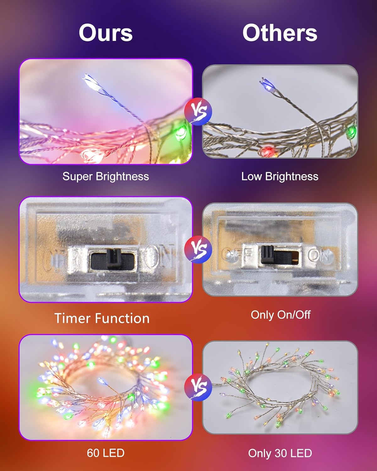 - Firefly Starry Lights: 4 pack 60 super bright multi-colored LED lights on 5 feet long ultra-thin wire with 1 Inches distance between LED bulbs and 12 Inches clear cable between wire and battery box, 6 hours timing lighting, steady on or steady on + timer mode optional