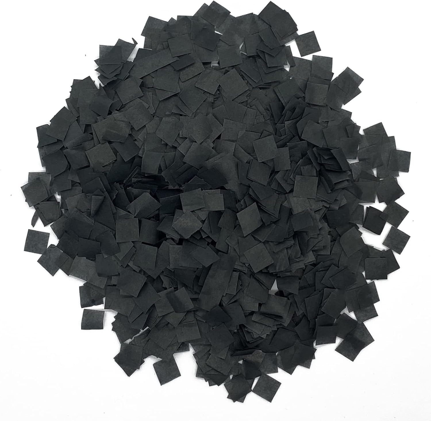 - BULK BLACK TISSUE PAPER CONFETTI - Each bag is 1 pound and includes approximately 16,000 individual pieces of confetti, or about 20 handfuls. Shorter than standard confetti, the average size of each small confetti piece is .25" x .25".