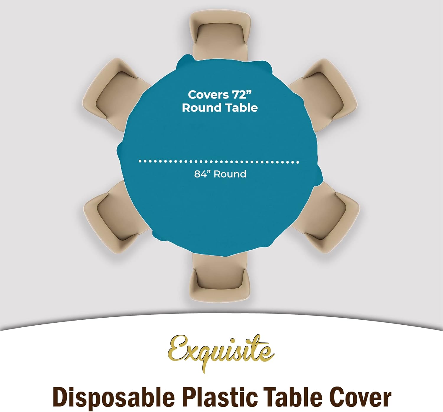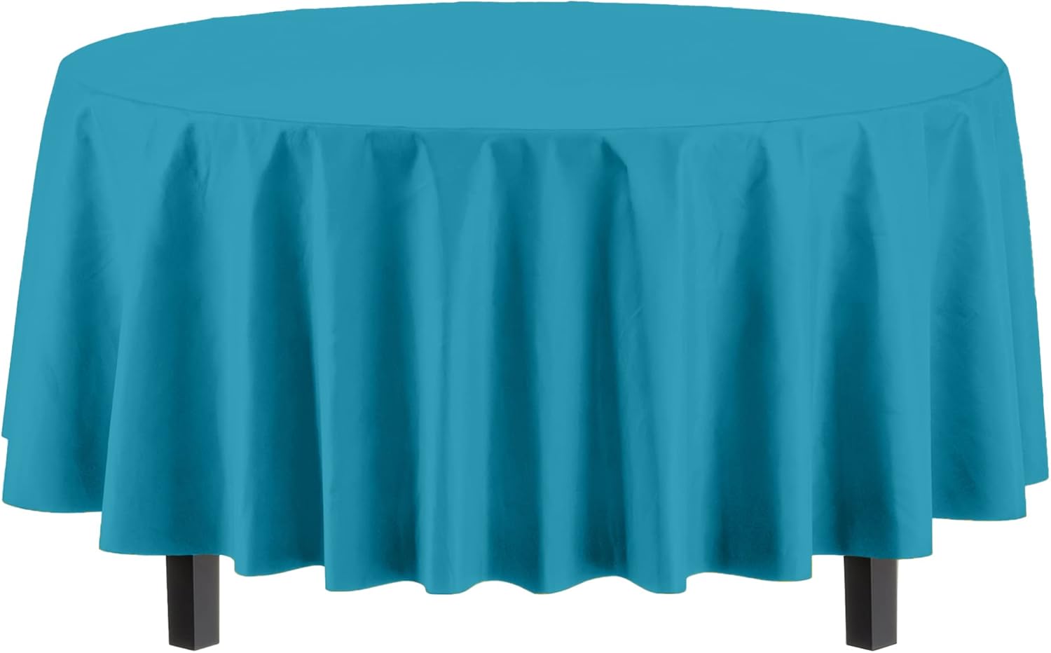 - PREMIUM QUALITY PROTECTION: This 12 pack of 84 in. Turquoise Round plastic tablecloths will cover any table up to 7 feet. Unlike your typical paper table clothes these disposable table covers for parties are spill and waterproof!!!