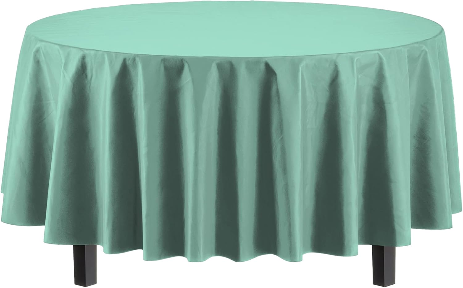 - PREMIUM QUALITY PROTECTION: This 12 pack of 84 in. Light Mint Round plastic tablecloths will cover any table up to 7 feet. Unlike your typical paper table clothes these disposable table covers for parties are spill and waterproof!!!