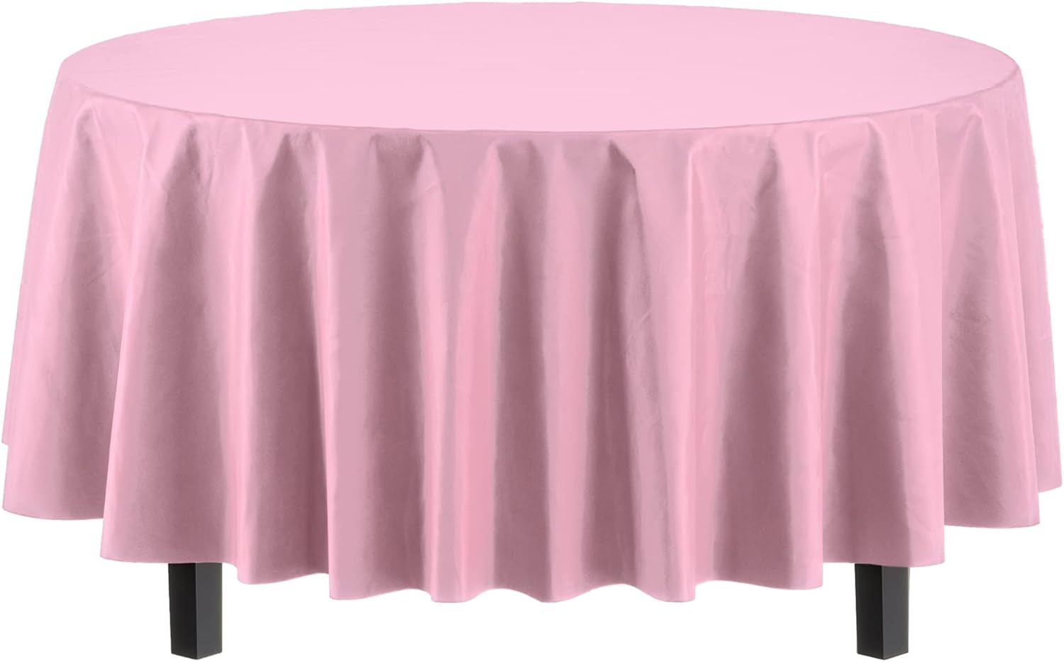 - PREMIUM QUALITY PROTECTION: This 12 pack of 84 in. Pink Round plastic tablecloths will cover any table up to 7 feet. Unlike your typical paper table clothes these disposable table covers for parties are spill and waterproof!!!