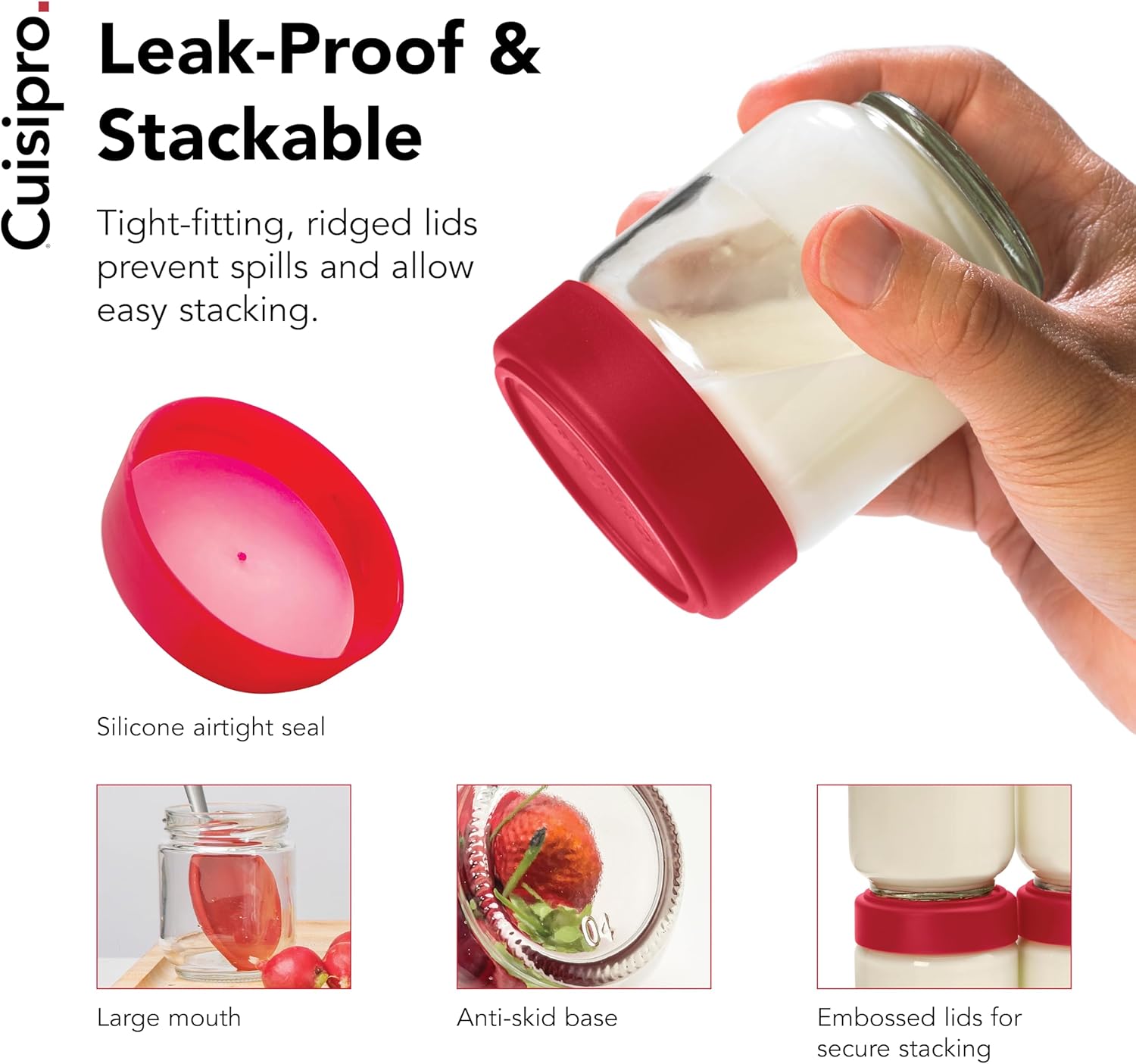 - Wide Mouth Design with Airtight Lid: Compared to regular mouth ones, Cuisipro glass jars with a wider mouth are more convenient to scoop out food and clean, more time saving and effort saving; With interchangeable artlight lid, the glass jars are capable of keeping freshnees of food and preventing leakage