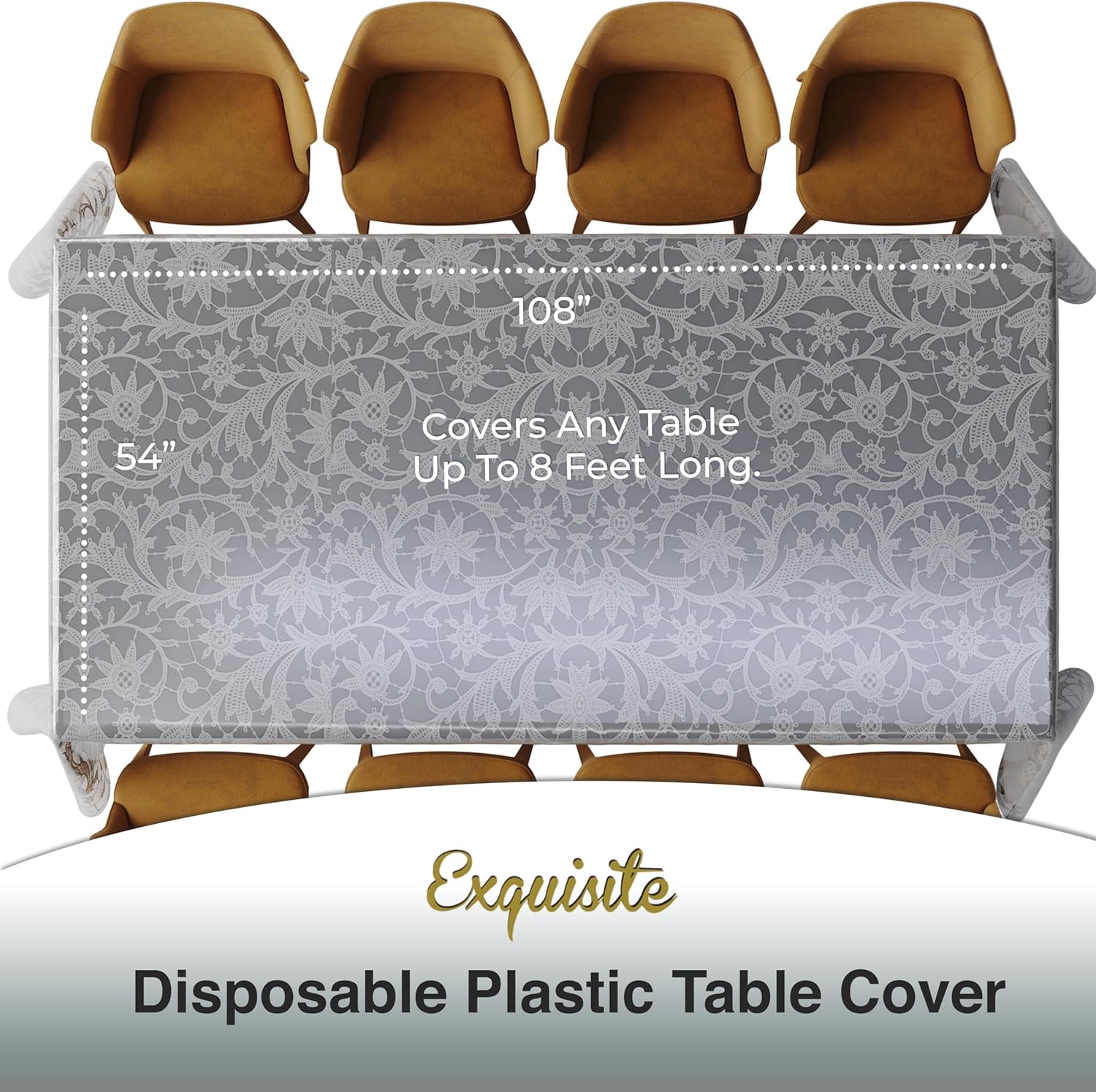 - Includes: This 12-pack of transparent silver lace table cloth rectangle table coverings offers elegant protection for your furniture. Each silver table cloth rectangle measures 54" X 108", making it ideal for standard tables. These clear plastic table cloth disposable covers combine functionality with beauty. Being disposable tablecloth yet fancy flower tablecloth at the same time.
