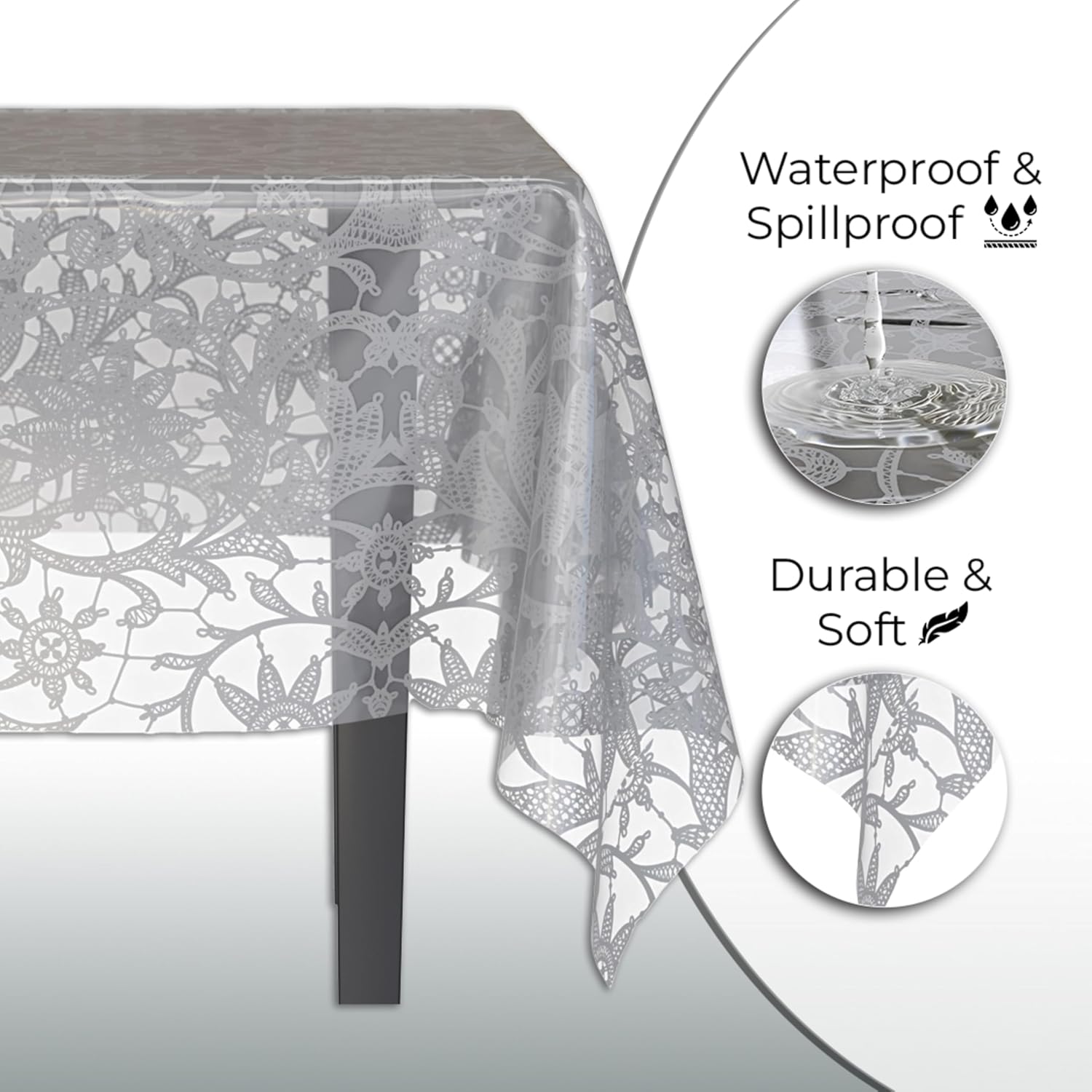 - Original Design: These table covers for party offer a unique floral lace pattern, these lace floral table cloth rectangle table coverings add a touch of elegance to any setting. The silver table cloth rectangle design enhances décor while still offering the convenience of plastic. Enjoy your next event with these floral tablecloth disposable