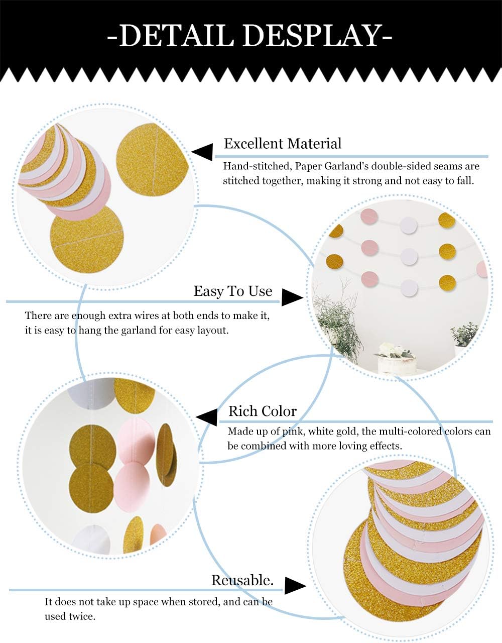 - What You Get: MerryNine Paper Garland Circle Polka Dots Set comes with 5 pack, each pack paper garland is 13 Feet (Total 65 Feet) and each circle dot is approximately 2 inch in diameter