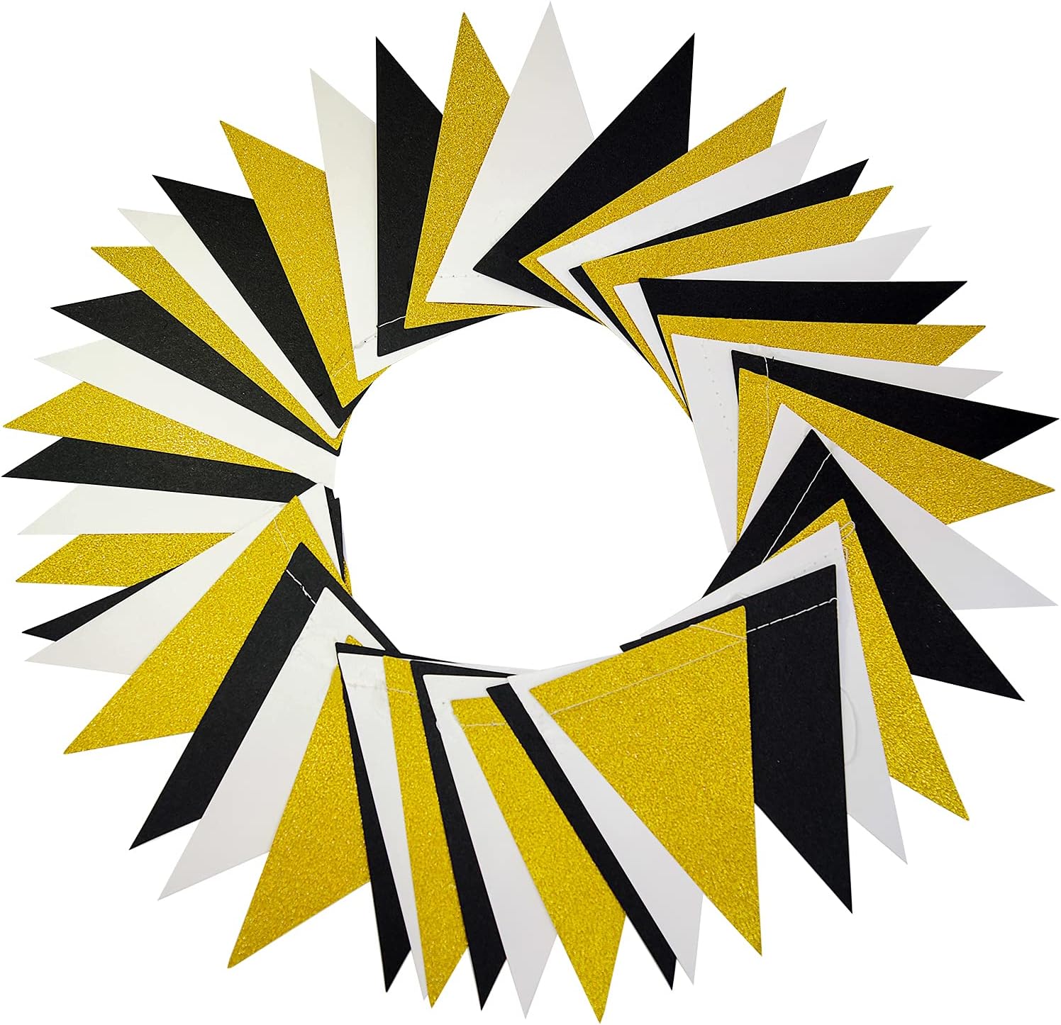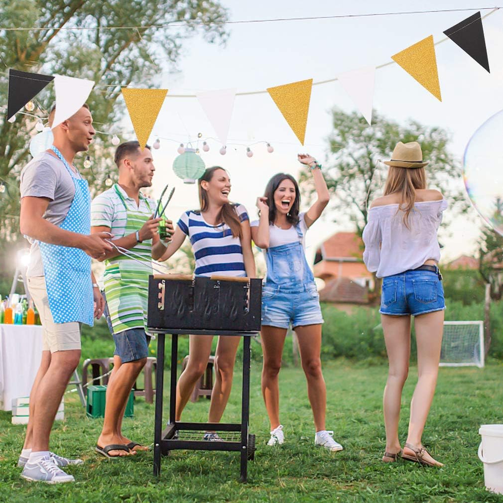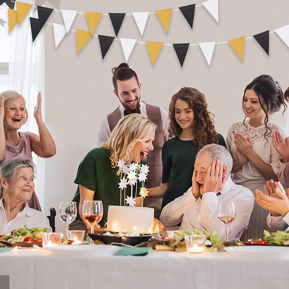 MerryNine Triangle Flag Bunting Banner, 3 Pack 30 Feet Vintage Style Pennant Banner for Wedding, Baby Shower, Event & Party Supplies 45pcs Flags (Triangle Flag - Black White Gold Glitter)