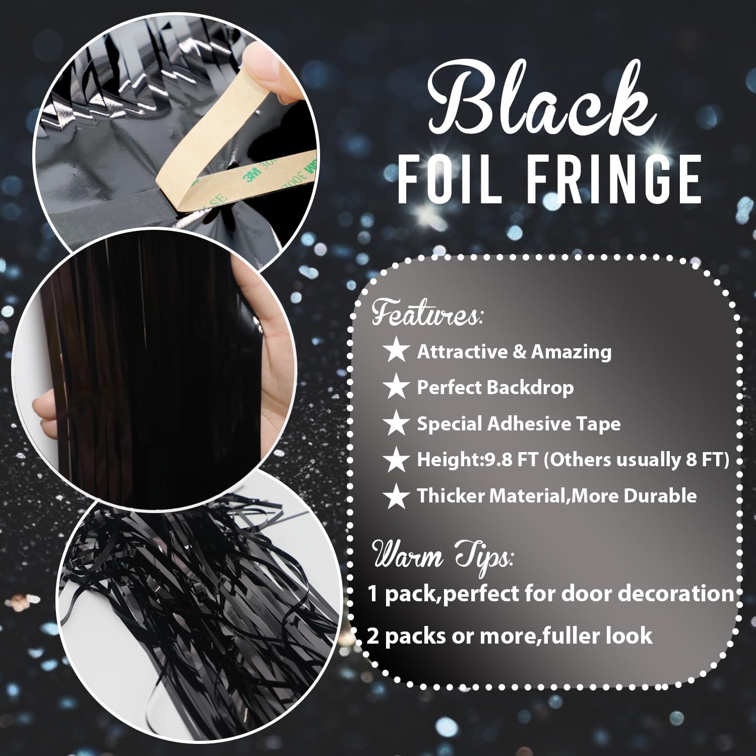 - Package Includes:1 pack black foil fringe curtain,3.2 ft x9.8 ft each,suitable for hanging on a door or coverage a wall fully