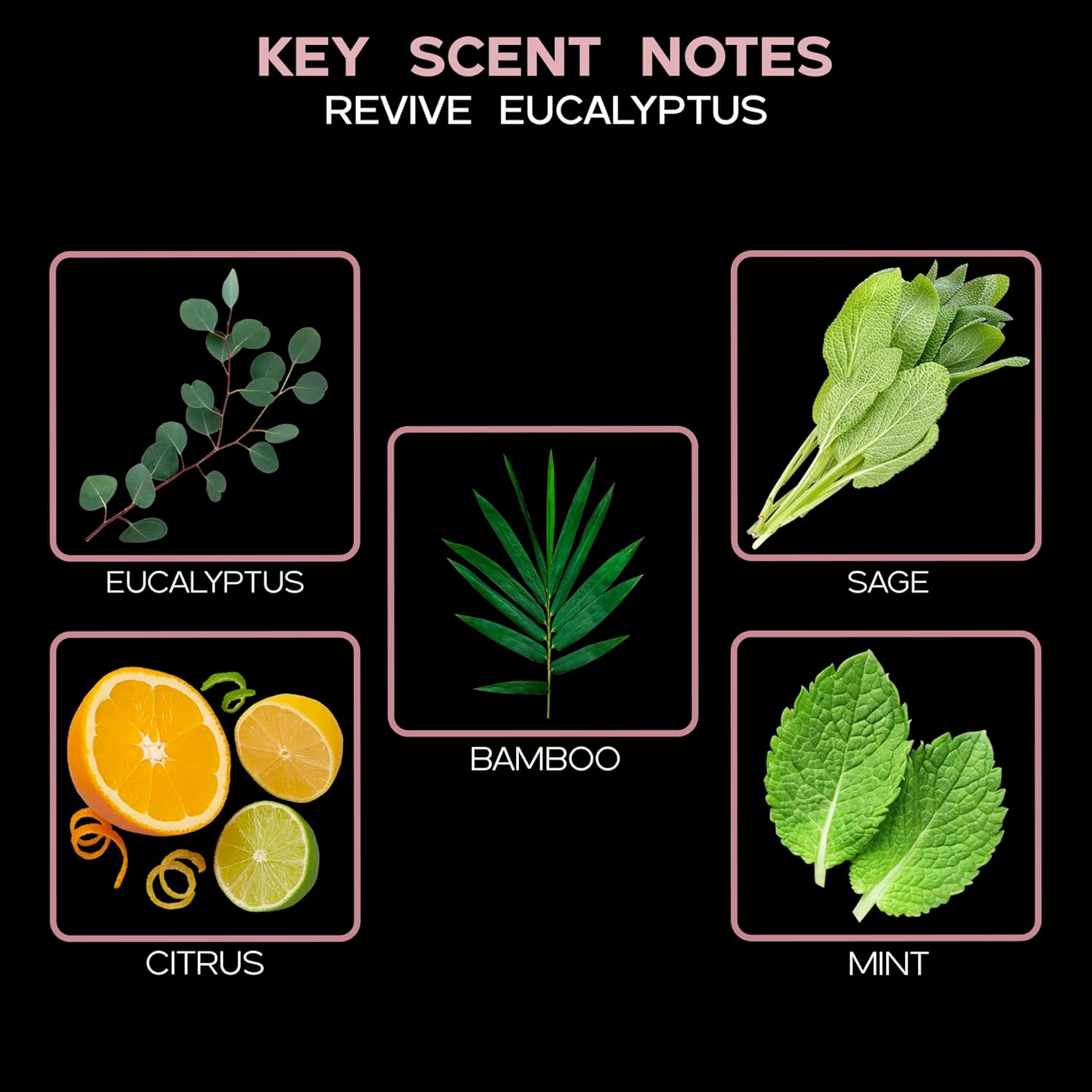 - REVIVE EUCALYPTUS – is a crisp, refreshing mix of Eucalyptus, Sage, Bamboo, Citrus, and Mint; the Bell Diffuser topped with a sage green ribbon accent gives a clean, herbal finish; perfect for olive, moss, and spa-inspired interiors.