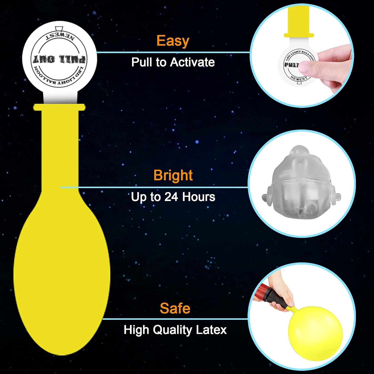 - Child Safe: The sturdy glow balloons are made with high quality latex and safe to be used around children; The light up balloon can be filled with helium or air up to 12 inches