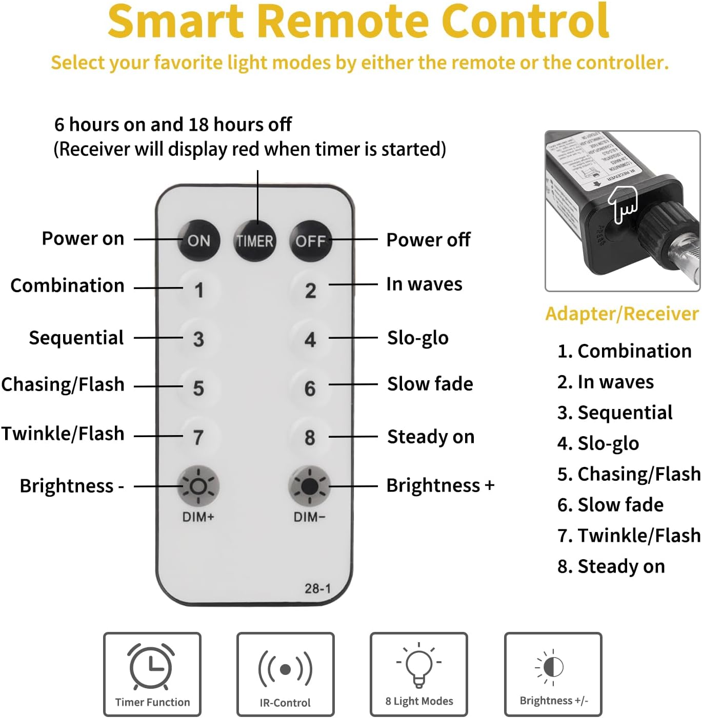 - Multifunction with remote: A. With remote easily turn the hanging lights on or off from a distance. B. Timer: 6 hours on and 18 hours off. Press timer again and red light on the controller to shut off the timer. C. 8 Display options: combination, in waves, sequential, slogs, chasing flash, slow fade, twinkle flash, steady on. D. 4 options of brightness for nice ambiance in the room