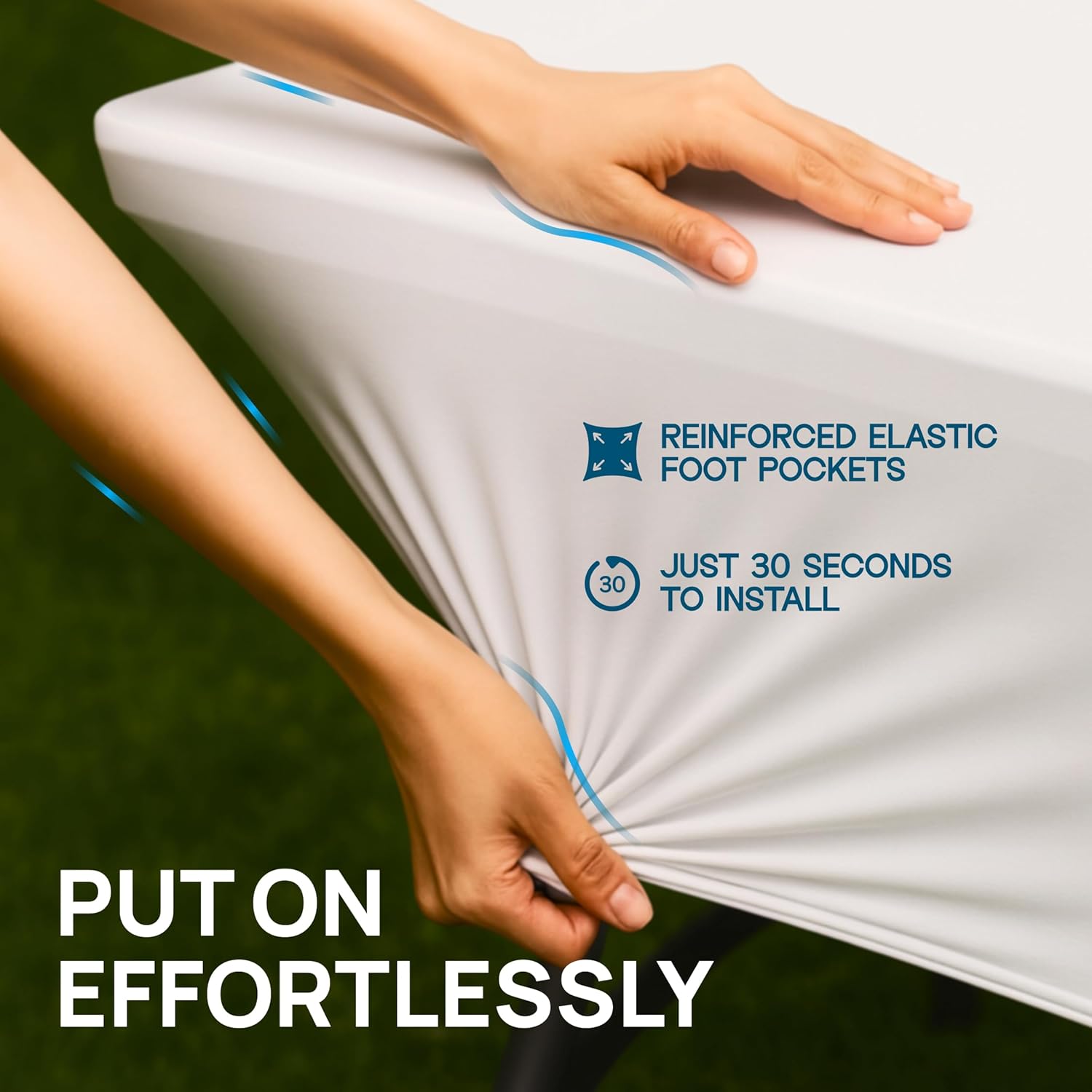 - Quick and Easy Setup: Transform your table in just 30 seconds with our white table cloth rectangle! Wrap the 6 foot table cover fitted around your 6-foot table, slip the legs into the elastic pockets, and achieve a flawless look effortlessly
