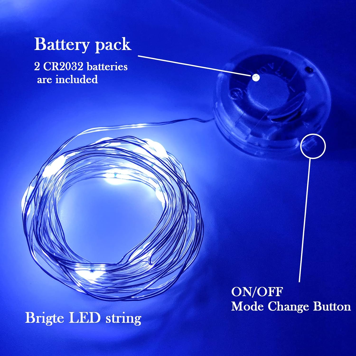 - Easily Powered by Batteries: 2 x CR2032 included in tiny battery box, which is easy t hide, and the batteries can be easily replaced with screwdriver. Push button on battery box make it easy to turn on and off, and switch lighting modes. 12 hours continuous battery life and longer if using with breaks. Batteries need to be replaced when the lights get dim.