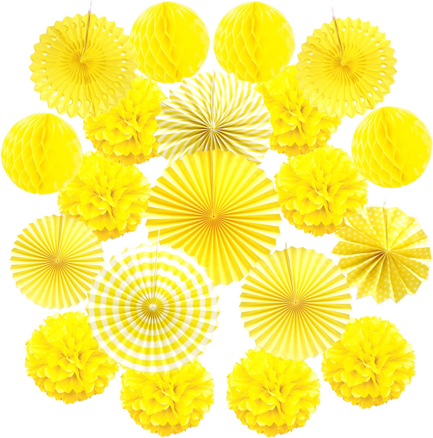 Hanging Paper Fan Set, Tissue Paper Pom Poms Flower Fan and Honeycomb Balls for Birthday Baby Shower Wedding Festival Decorations - Yellow
