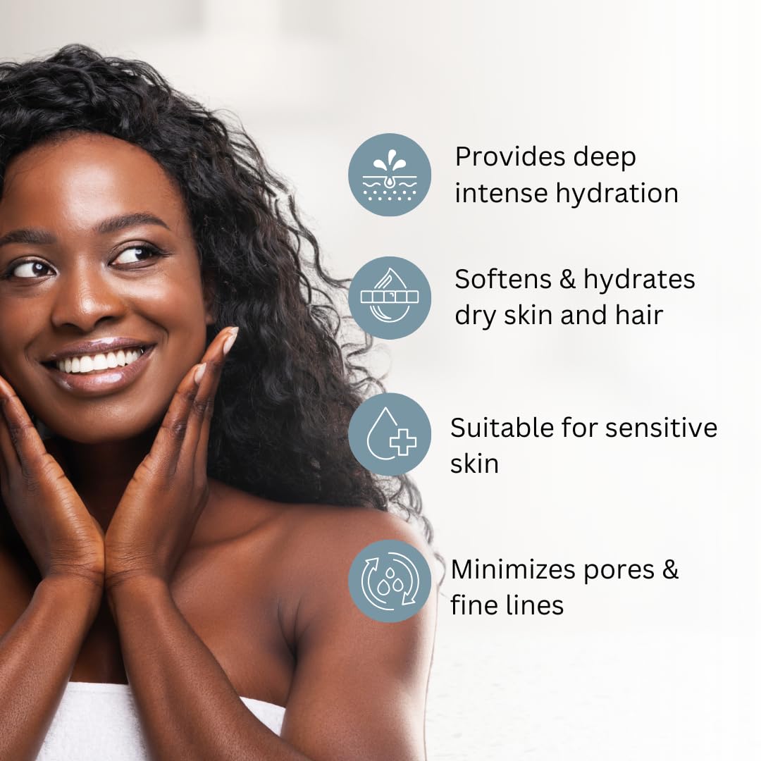 • Moisturizing and Soothing Properties: A powerful, yet lightweight moisturizer that is naturally unscented, non-comedogenic, and suitable for sensitive skin. Perfect for dry and damaged hair and skin caused by psoriasis or eczema.