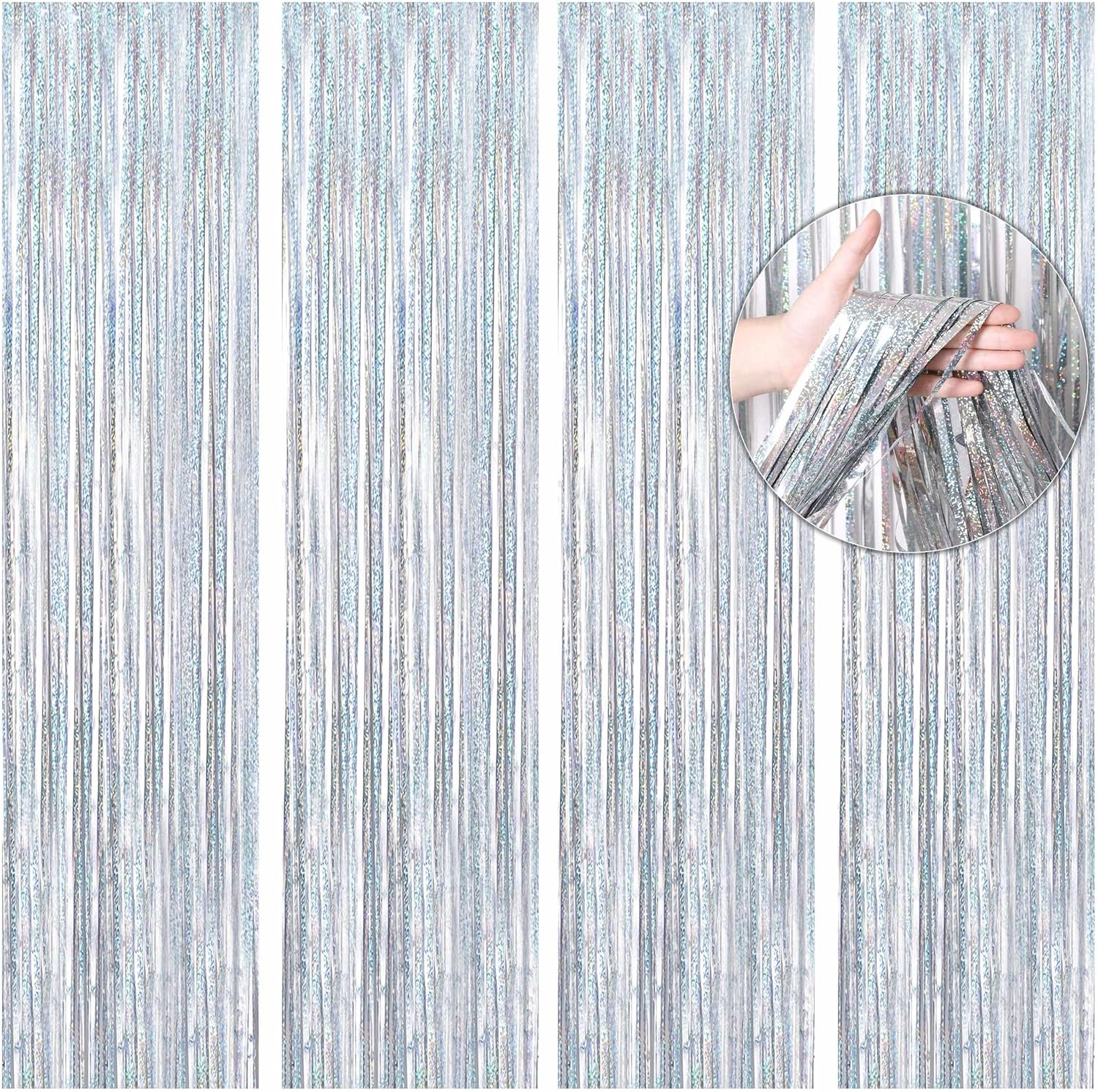 BTSD-home 4 Pack Laser Silver Foil Fringe Curtain Holographic, Metallic Photo Booth Tinsel Backdrop Door Curtains for Wedding Birthday Baby Shower Bachelorette Party Decorations(3ft x 8ft)