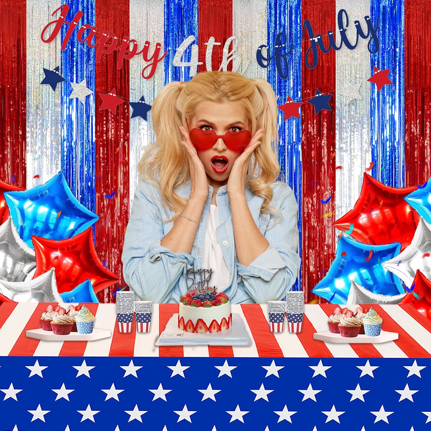 Melsan 2 Pack Red Tinsel Foil Fringe Curtains Backdrop, Sparkle Tinsel Backdrop Curtains for Fourth of July Patriotic Birthday Party Decorations