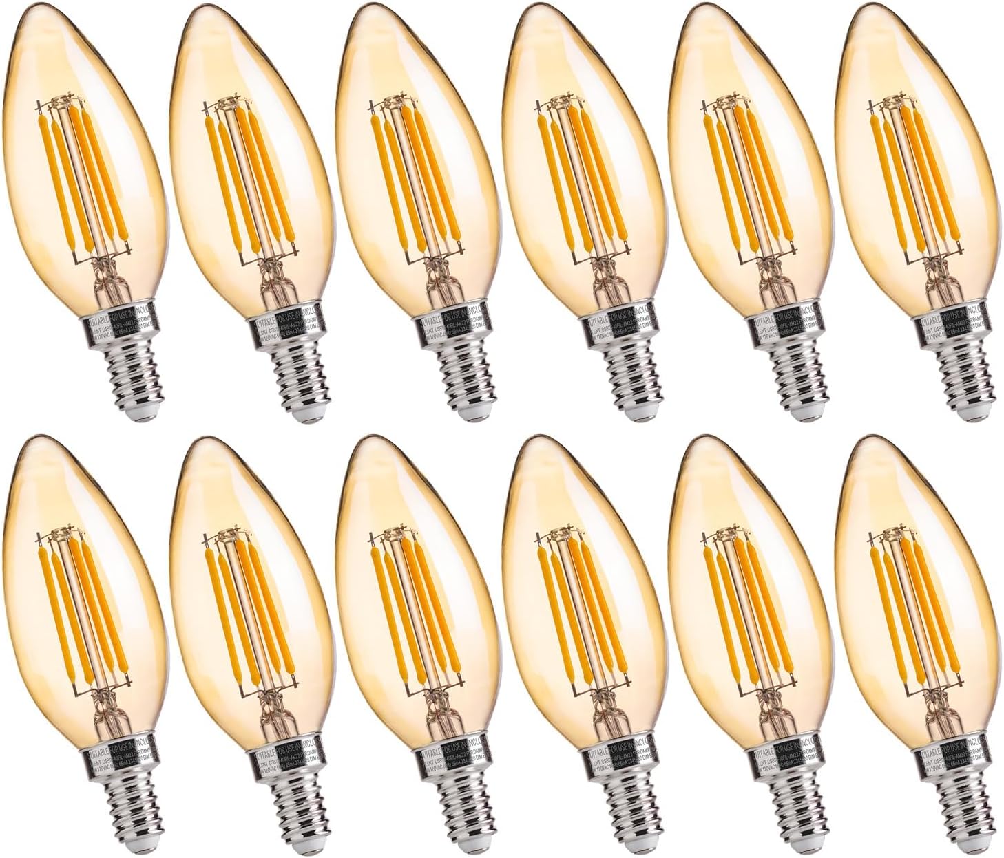 FLSNT LED Candelabra Light Bulbs 40W Equivalent, B11 E12 Small Base Chandelier Bulbs, 2200K Warm White, Dimmable, 330LM, Amber Glass Finishing, 12 Pack UL,CA65 Listed.