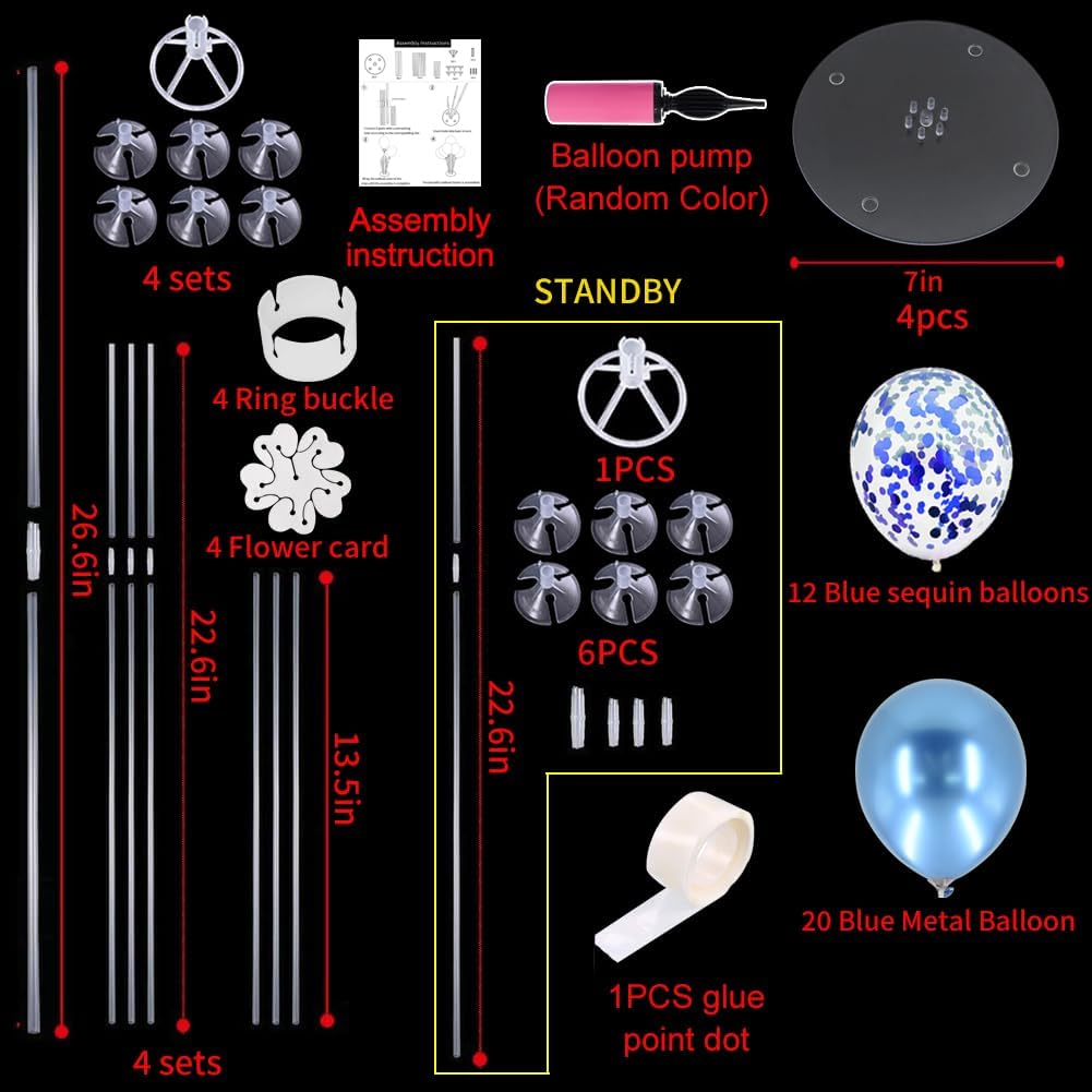 - Package Includes: The balloon stand kit includes 4 reusable balloon centerpiece table decorations and 12 inch 32 pcs Latex Balloons(20 metallic blue balloons,12 blue confetti balloons),glue point dots,balloon pump,balloon clips,and tie tool.You don’t need to waste money to buy balloons