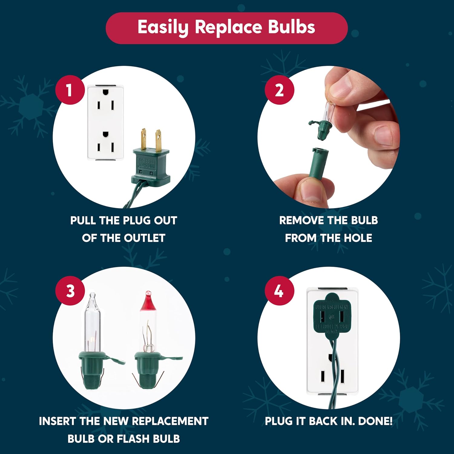 - INDEPENDENT CIRCUIT & REPLACEMENT BULBS - Enjoy a hassle-free holiday! Our lights feature an independent circuit system; if one bulb burns out, the rest stay lit. The set includes 6 spare bulbs, 3 replacement fuse, and 3 test flash bulbs., ensuring your display stays bright throughout the season without needing a full replacement.
