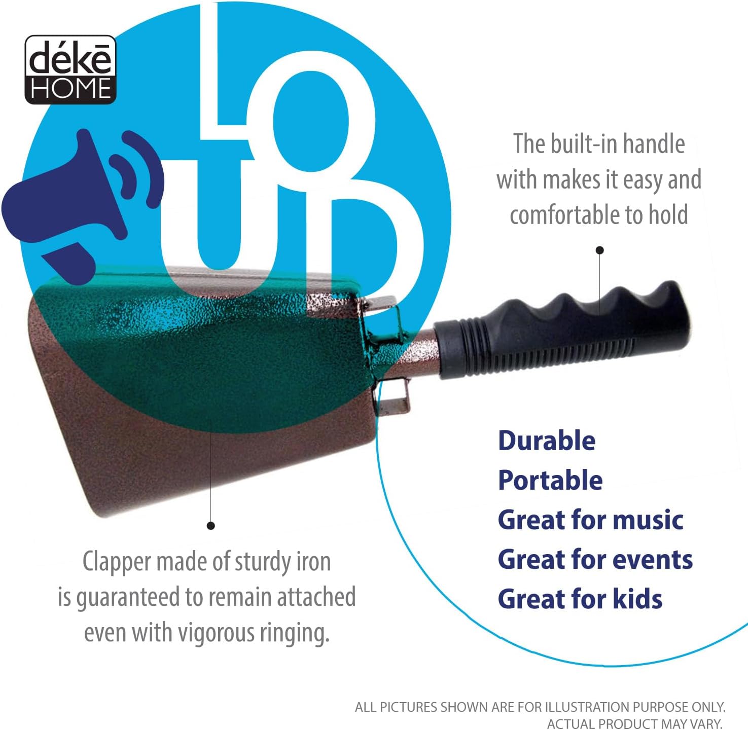 Deke Home - 2 Pack 10 Inch Steel Cowbells with Handle, Loud Noise Makers for Football, Sports, Parties, Competitions, School Spirit & Safety, Large Hand Bell for Cheering & Percussion Instrument