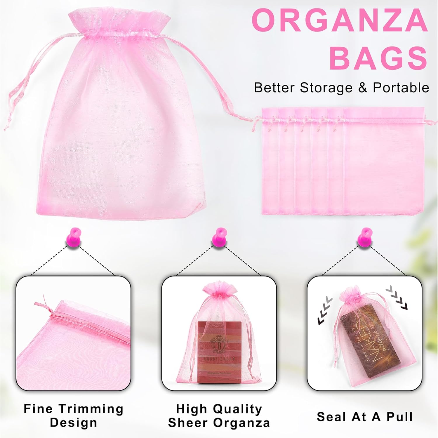 - đăPremium MaterialăOur pink organza bags are made of high quality sheer organza material, delicate and elegant. The seams are also sewn really well around the outside and on both sides of the drawstring, more strong and durable.