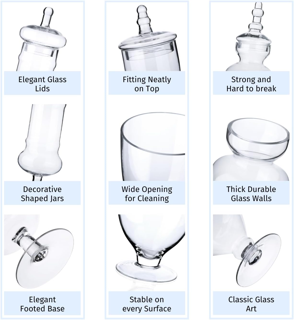 Set of 3 Apothecary Jar Glass Decorative Candy Jars Elegant Storage Candy Buffet Display, Wedding Candy Organizer Canisters (H: 9", 12.5", 14"; 20 FL.OZ, 23 FL.OZ and 28 FL.OZ)