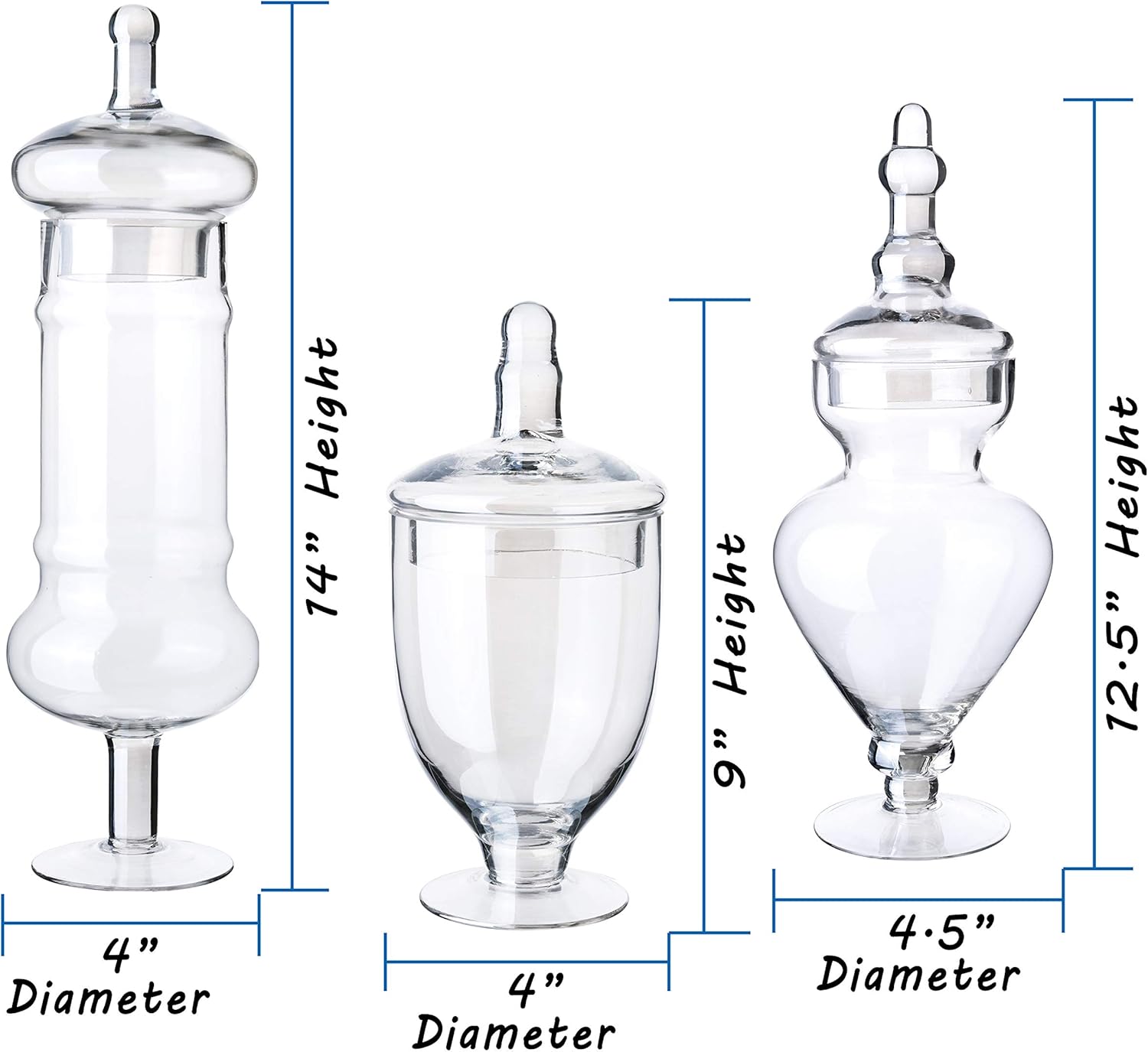 - DIFFERENT SIZES: This set of 3 apothecary jar glass with iridescent color includes 3 beautiful candy glass jars with lids in varying shapes and sizes. The size of the candy jars for candy buffet are approximately (with lids) 9" (H) x 4" (D), 12.5" (H) x 4.5" (D), 14" (H) x 4 "(D). Their capacities are 20 ounces, 23 ounces and 28 ounces, respectively.