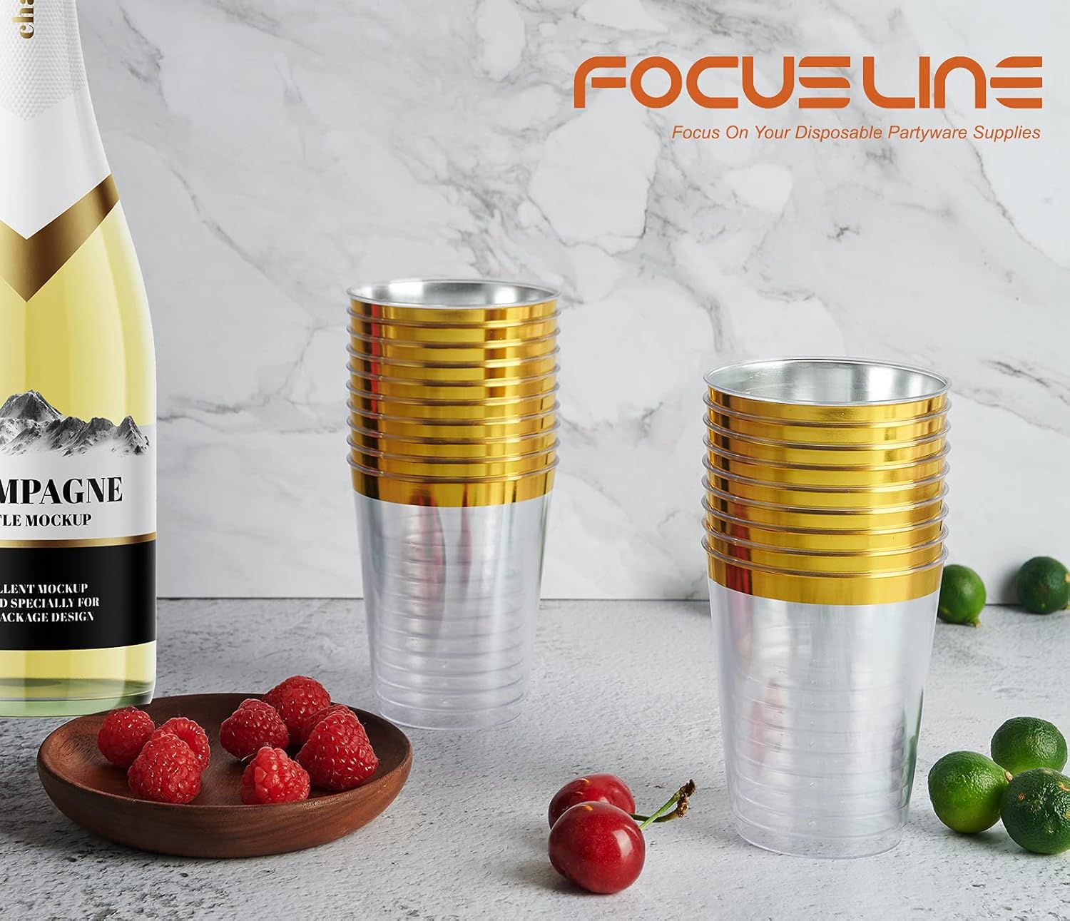 FOCUSLINE 10 oz Gold Plastic Cups, Disposable Clear Fancy Hard Plastic Cups, Gold Rimmed, Heavy Duty, Reusable,100 Count