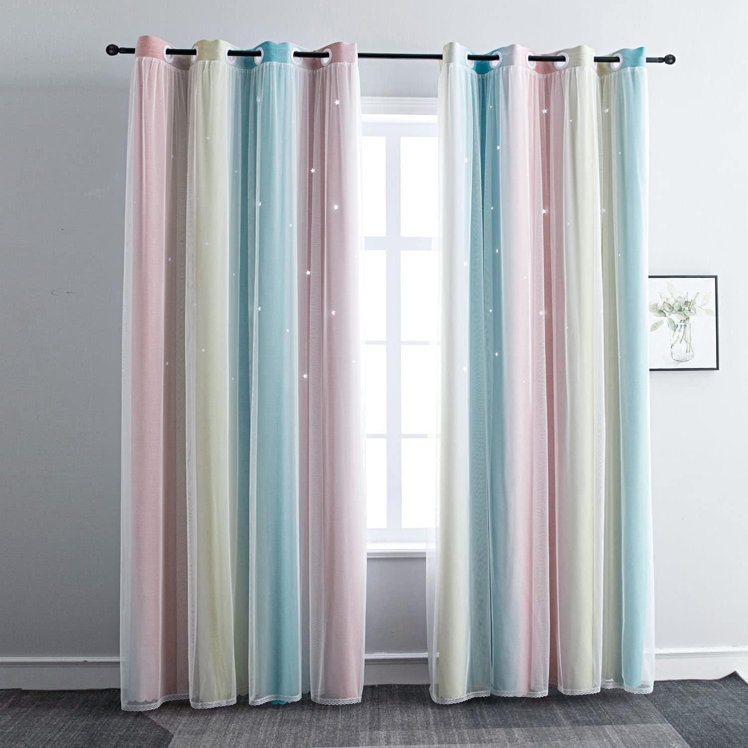 FANLI Ombre Rainbow Blackout Curtains for Kid Girls Bedroom Living Room Darking Stripe Double Layer Star Cut Out Wall Home Decor Gradient Grommet Window Curtains (Pink/Blue, 52W x 63L)