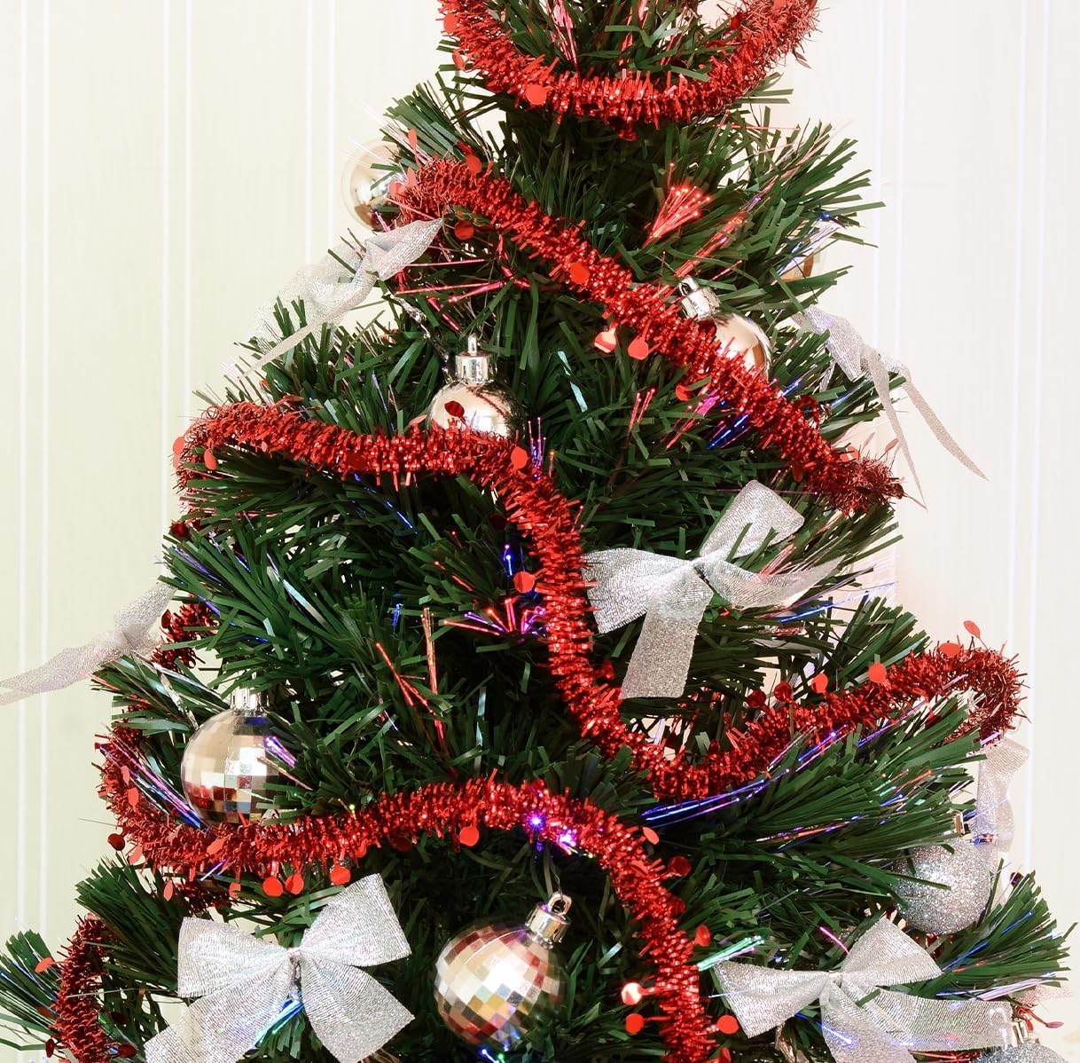 - Long Bulk Reusable Christmas Garland Tinsel Roll: The 0.75” wide twisted gold garland for Christmas tree is 30 feet in length. Great for living rooms, bedrooms, schools, & supermarkets, the Christmas tree gold tinsel also pairs well with string lights.