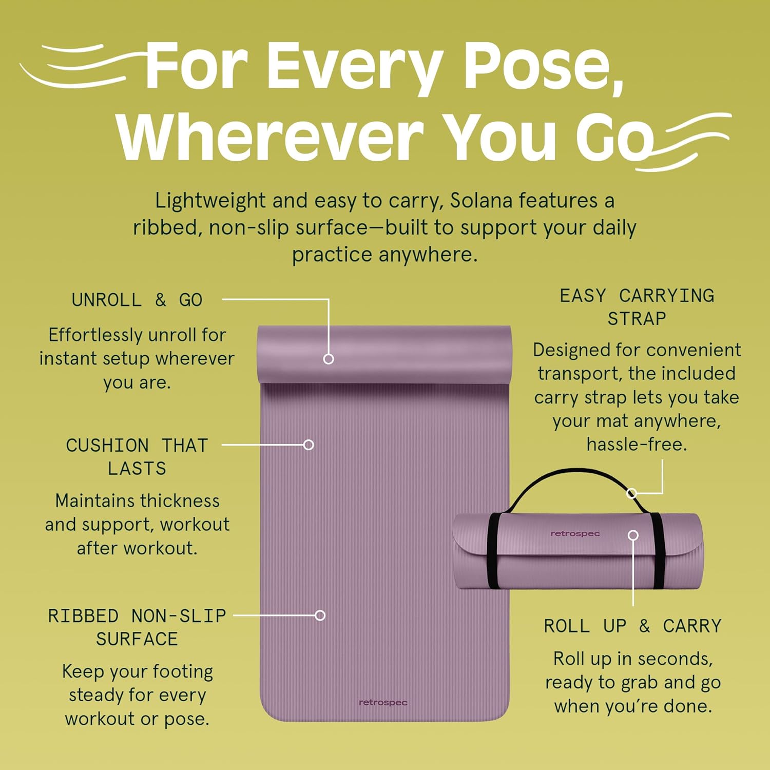 • EXTRA THICK FOR COMFORT & BALANCE: Solana firm 1-inch extra thick fitness mat w/ mat strap alleviates stress on pressure points such as joints, hips, hands, and knees. Solana measures 72" X 24" X 1".