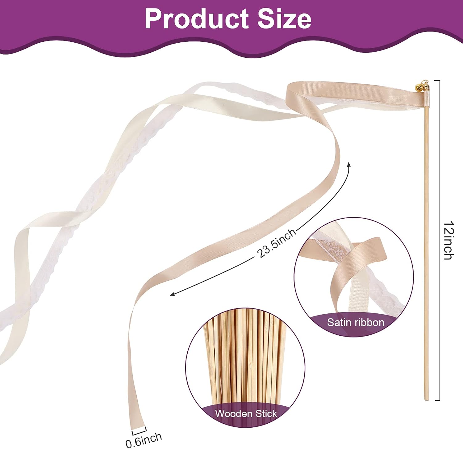 Sumind 40 Pieces Ribbon Wedding Streamers with Bells, Lace Fairy Wand Stick Party Ribbon Streamers Chromatic Silk Streamers for Party, Birthday and Holiday (Champagne)