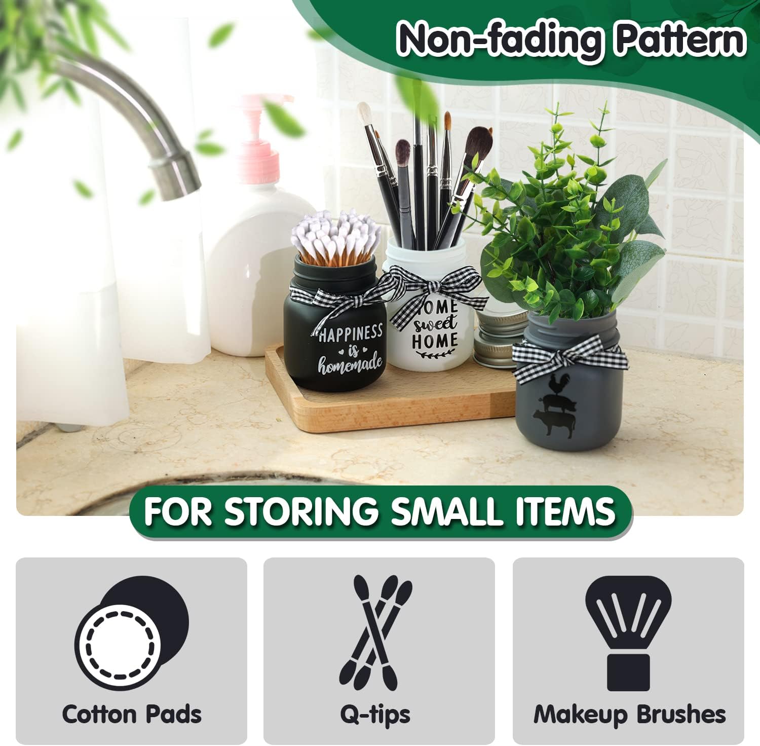 - Quality Glass and Storage Container: This 3-piece adorable farmhouse Mason jar ornament is made of premium glass is unpainted inside and will come with 3 lids so you can use it to store tea bags, coffee, hot cocoa, beans, etc. in your kitchen, coffee bar or party. You can also fill them with Q-tips, or put your makeup brushes inside to display in your bathroom. Or simply put it on your table as a vase or pencil holder.