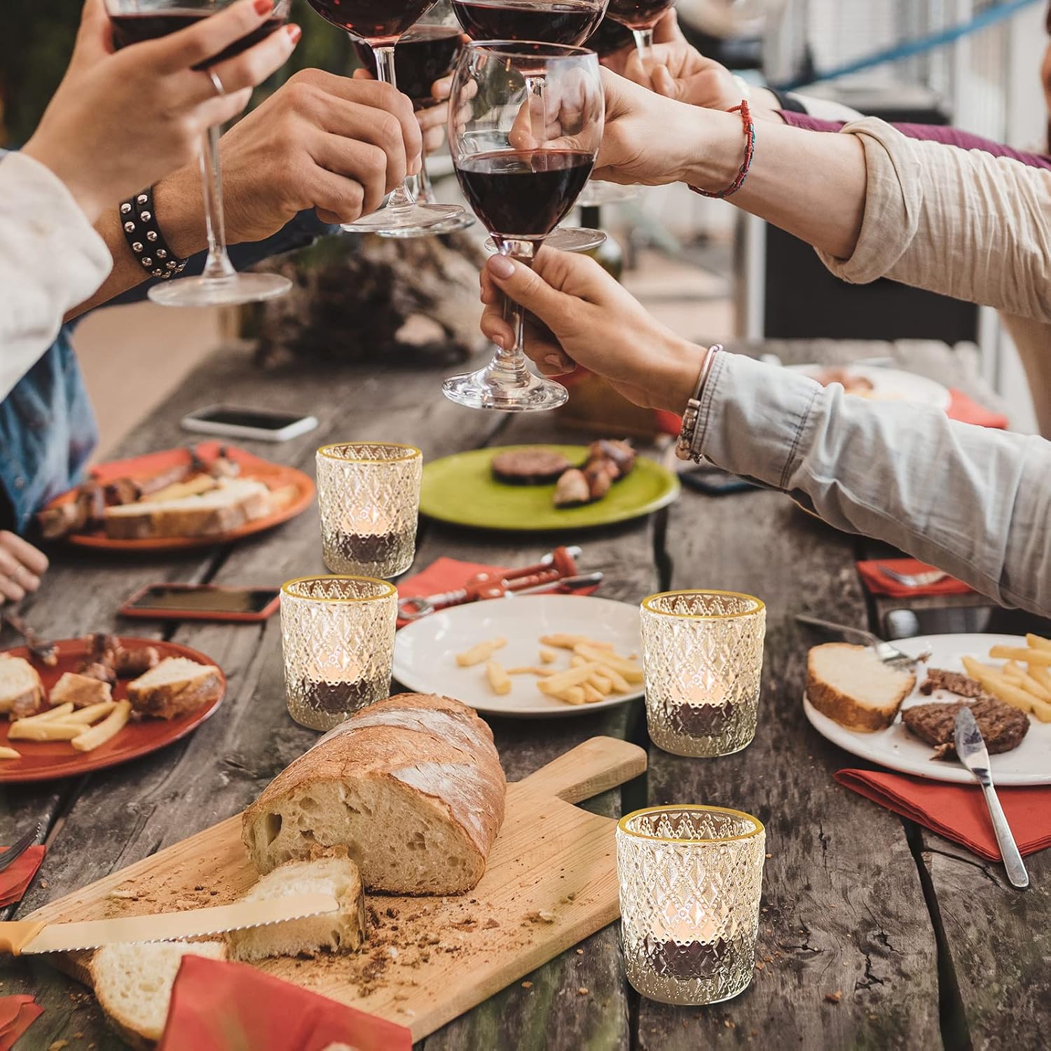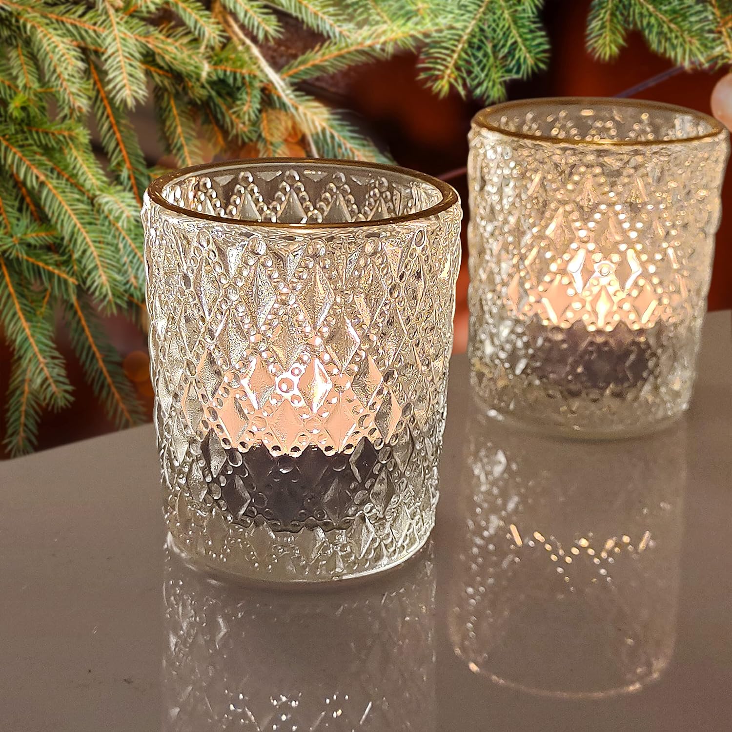 - Gold Rim Glass Candle Holder: 24 pcs clear glass candle holders set with elegant gold rim. The studded knobby glass let the light being scattered, making them much more interesting than simple votive candle holders