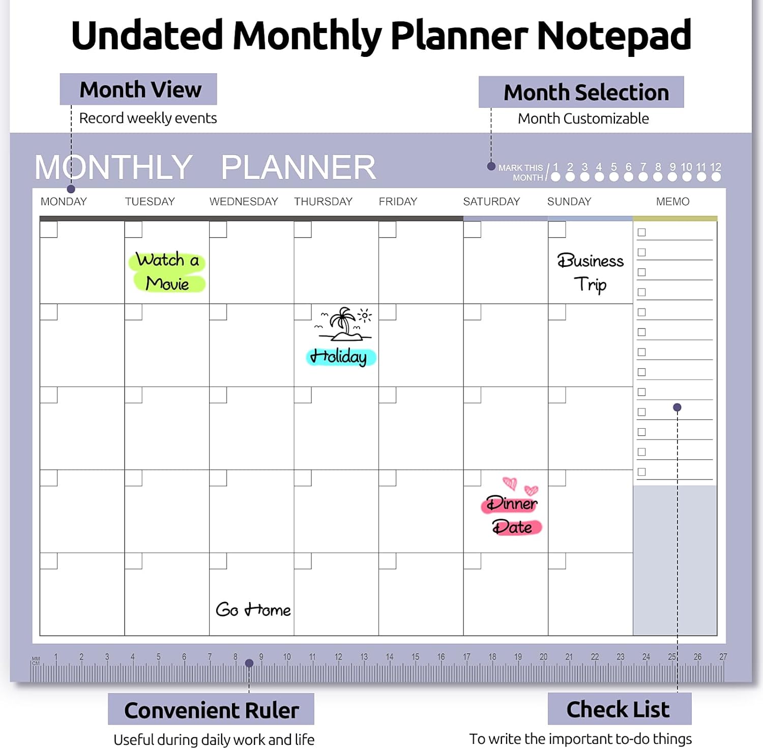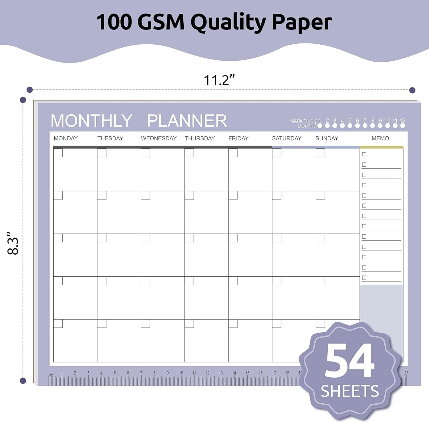 Phyxin Undated Planner, 54 Sheets Blank Calendar, 11.2" x 8.3" Monthly Calendar Planner, Tear Off Undated Monthly Planner with Memo for Women, Students, Teachers, Purple