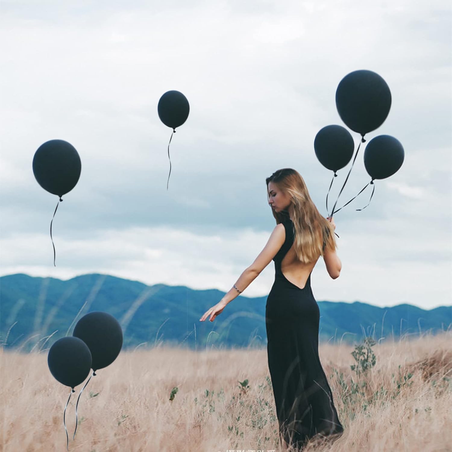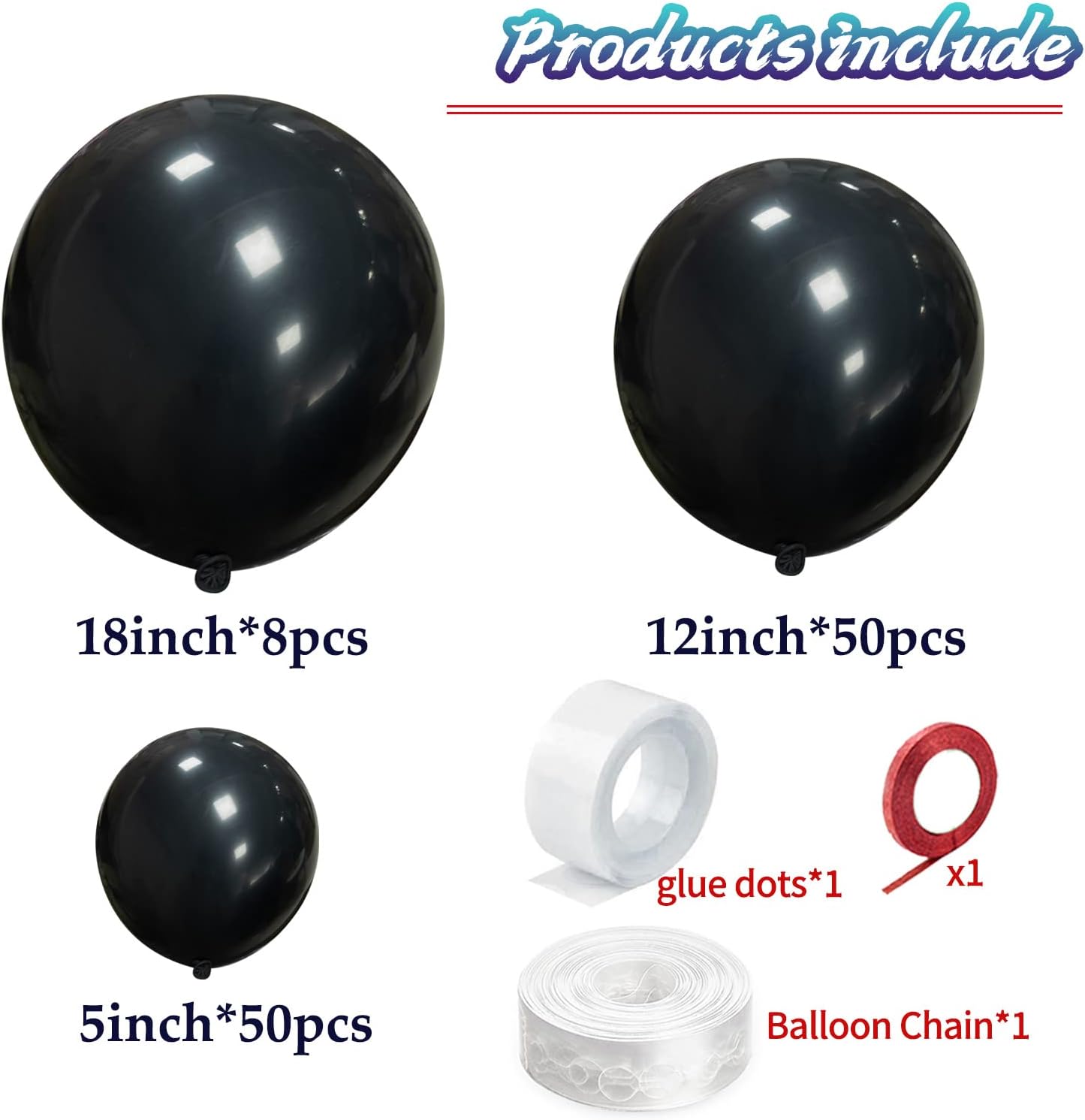 - Black balloon garland kit: 111Pcs Black balloons pack, including 8 pcs 18 inch balloons, 50 pcs 12 inch balloons, 50 pcs 5 inch balloons, a 5 meter balloon chain, 100 dots of glue dots, a roll of ribbon.