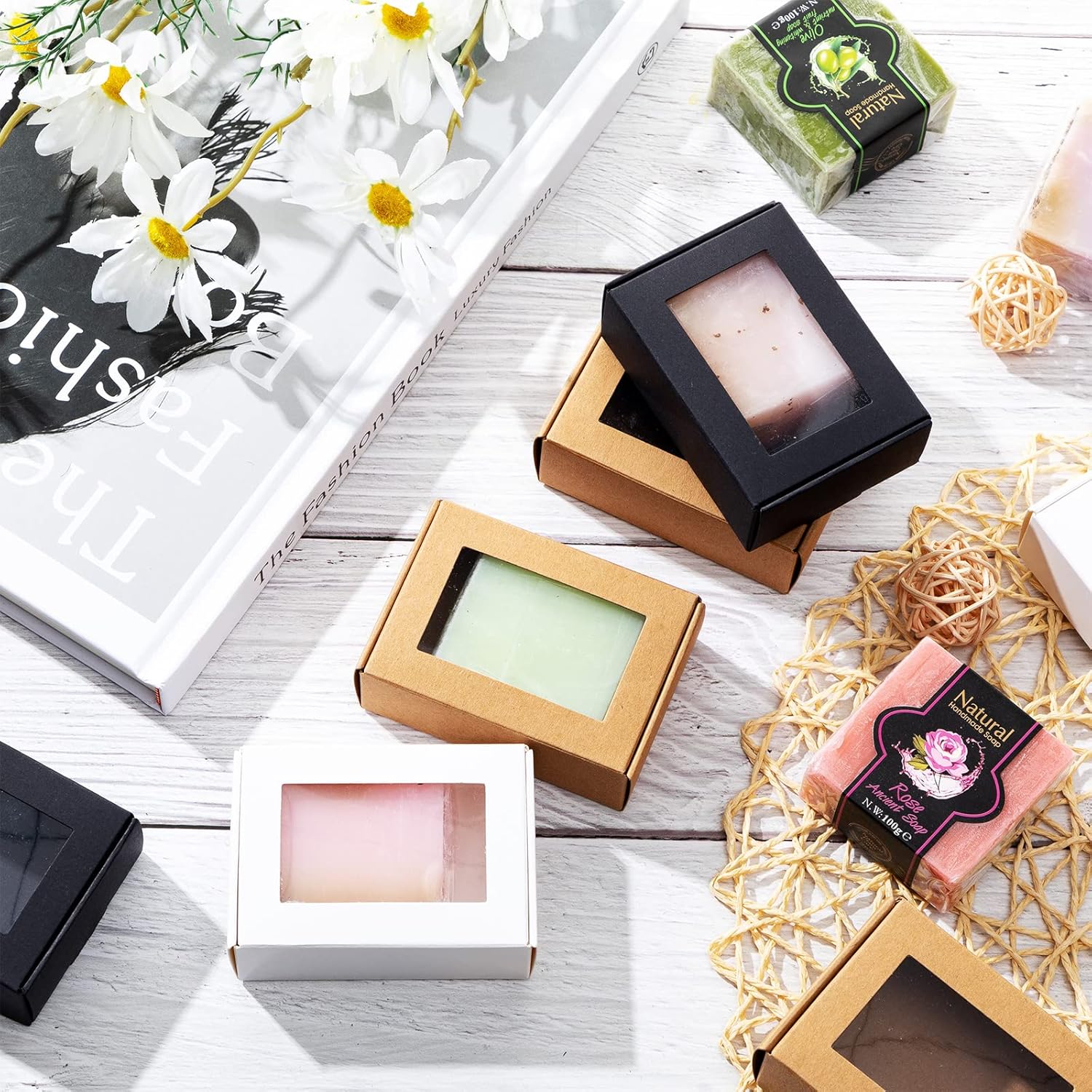 Zonon 30 Pcs Soap Boxes for Homemade Packaging, Mini Kraft Treat Boxes with Window for Bakery Candy Soap Making Gift Packaging(3.5 x 2.4 x 1.2 Inch,Black Brown White)