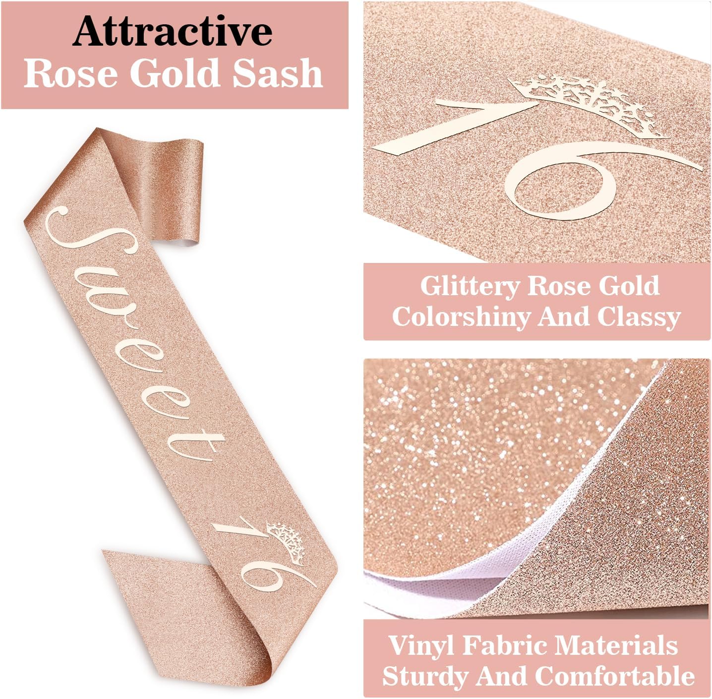 - 16th Birthday Decorations for Girls: Package coming with Rose Gold16th Birthday Tiara x 1pc, Rose Gold Sweet 16 Sash x 1pc, Sweet 16 Cake Topper x 1pc, Number 16 Candles for 16th Birthday x 1set, and a Classcial Birthday Card. This great valuable 16th birthday gift for girls rose gold has been packed in a beautiful gift box for ready presentation