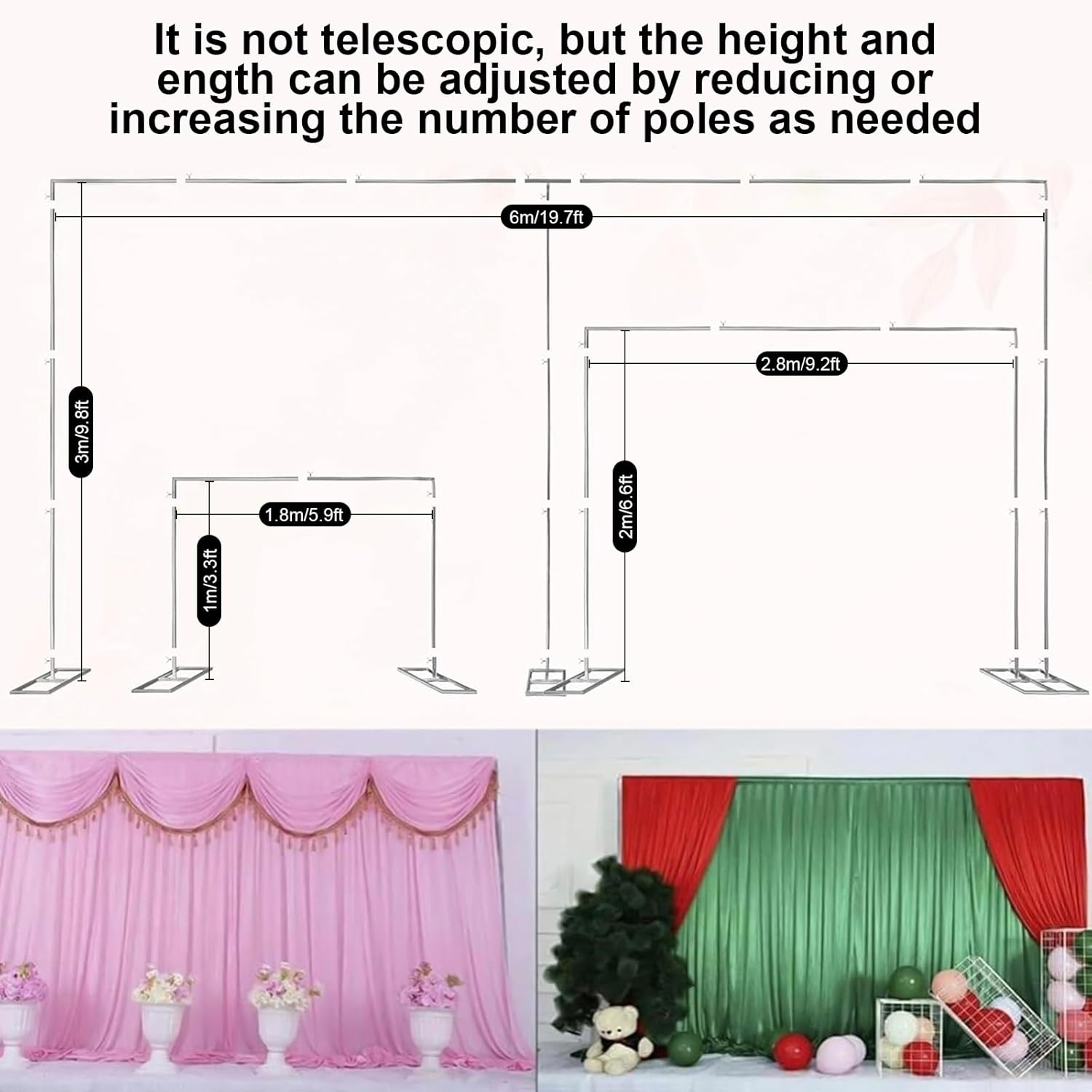 - 【Functional】 L: 6m/20ft, H: 3m/10ft, large support curtain frame wedding background stand enough to reuse in various major event stage decoration or studio photography. For garden wedding party, event background support, hanging curtain display, photography trade show display, indoor outdoor celebration host or photo booth decorate photography.
