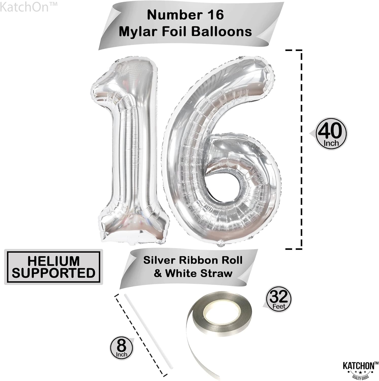 KatchOn, Silver 16 Balloon Numbers - Giant, 40 Inch | Happy 16th Birthday Balloons, Sweet 16 Party Decorations Silver | Sweet 16 Birthday Decorations Silver | 16th Birthday Decorations for Girls