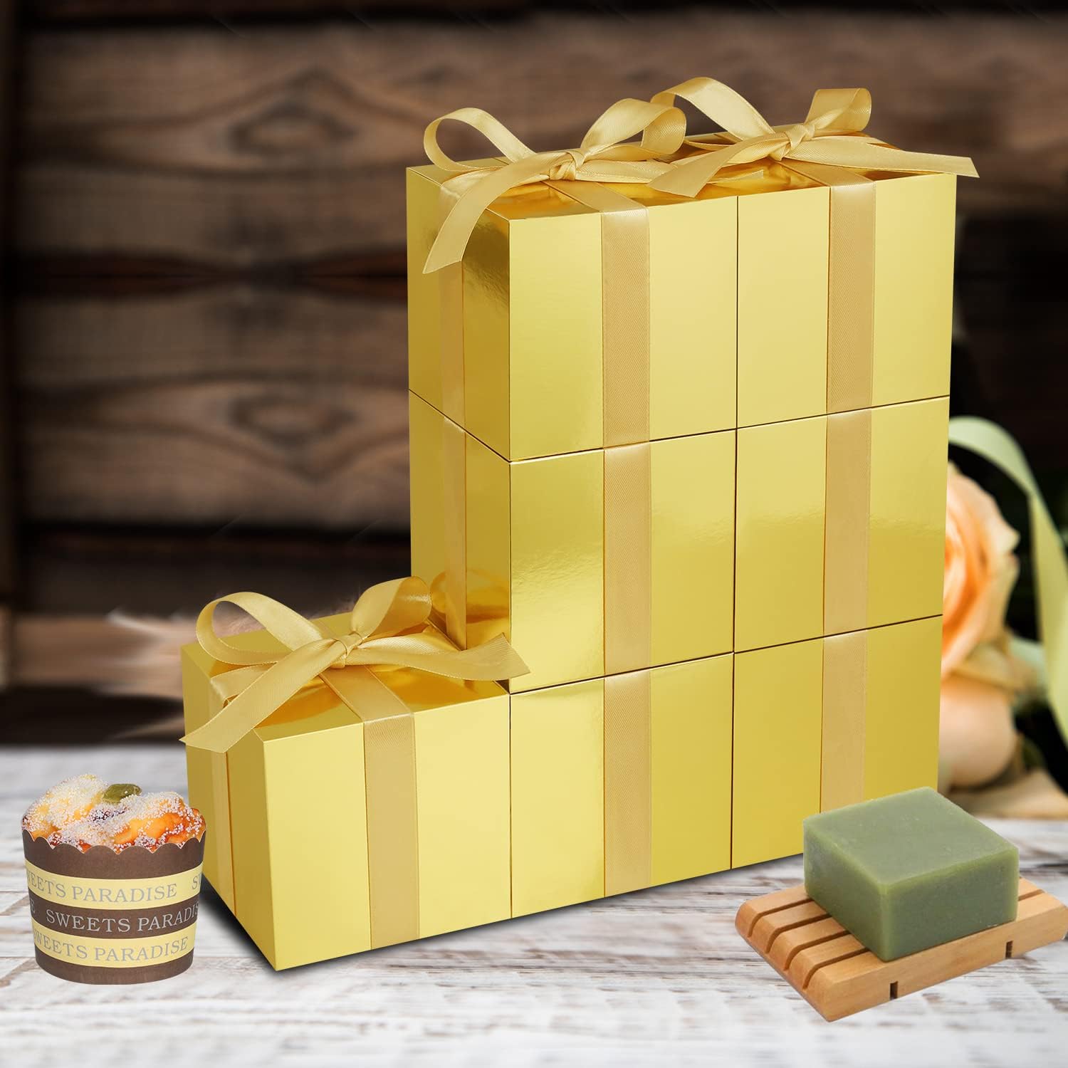 - Size Information: Wedding favor boxes size is 5x5x5 inch Inches, It is already equipped with ribbon and blank tag to complete the outside classy gift looks. Gold favor boxes are applicable to store candies, chocolates, cookies, cupcake, mugs, shot glasses, candles, bath bombs, soaps, perfumes, makeup, jewelry, or other small gift.
