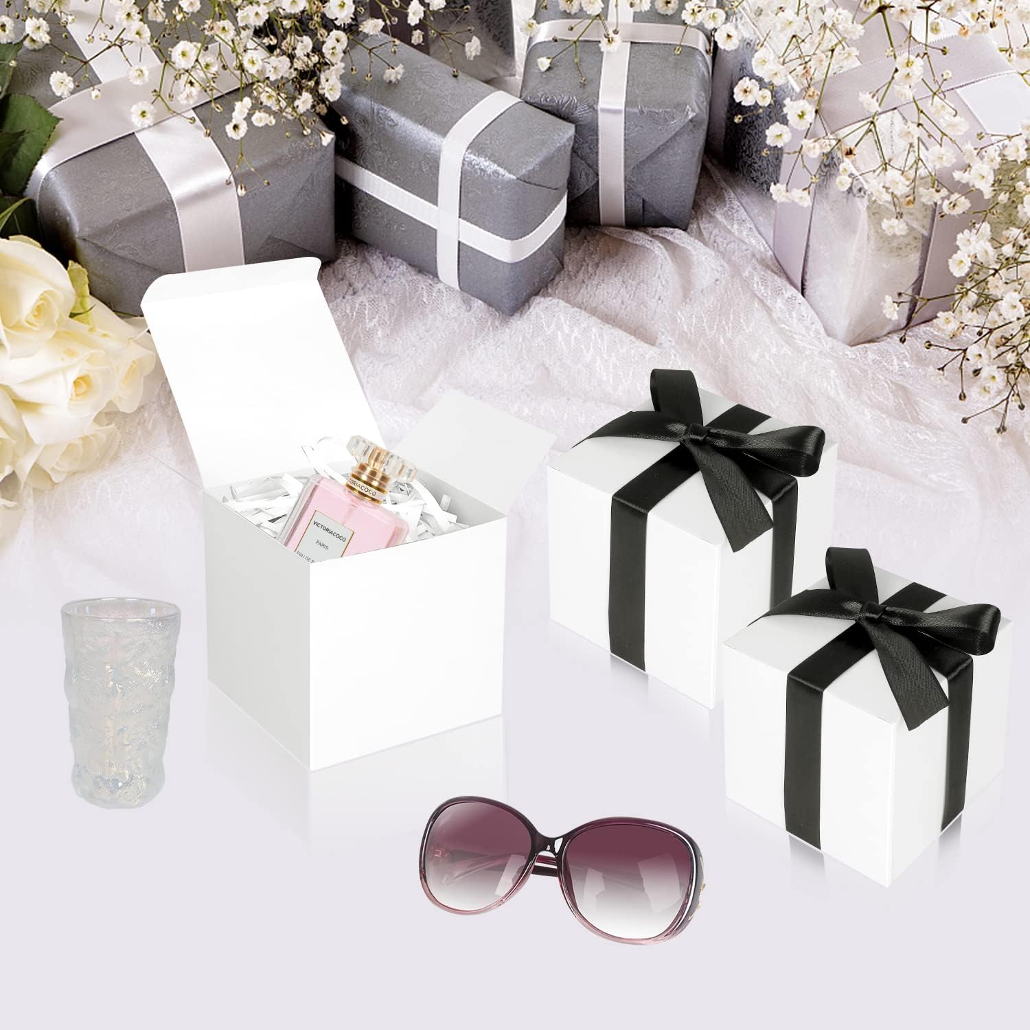 - Size Information: Wedding favor boxes size is 5x5x5 inch Inches, It is already equipped with ribbon and blank tag to complete the outside classy gift looks. White favor boxes are applicable to store candies, chocolates, cookies, cupcake, mugs, shot glasses, candles, bath bombs, soaps, perfumes, makeup, jewelry, or other small gift.