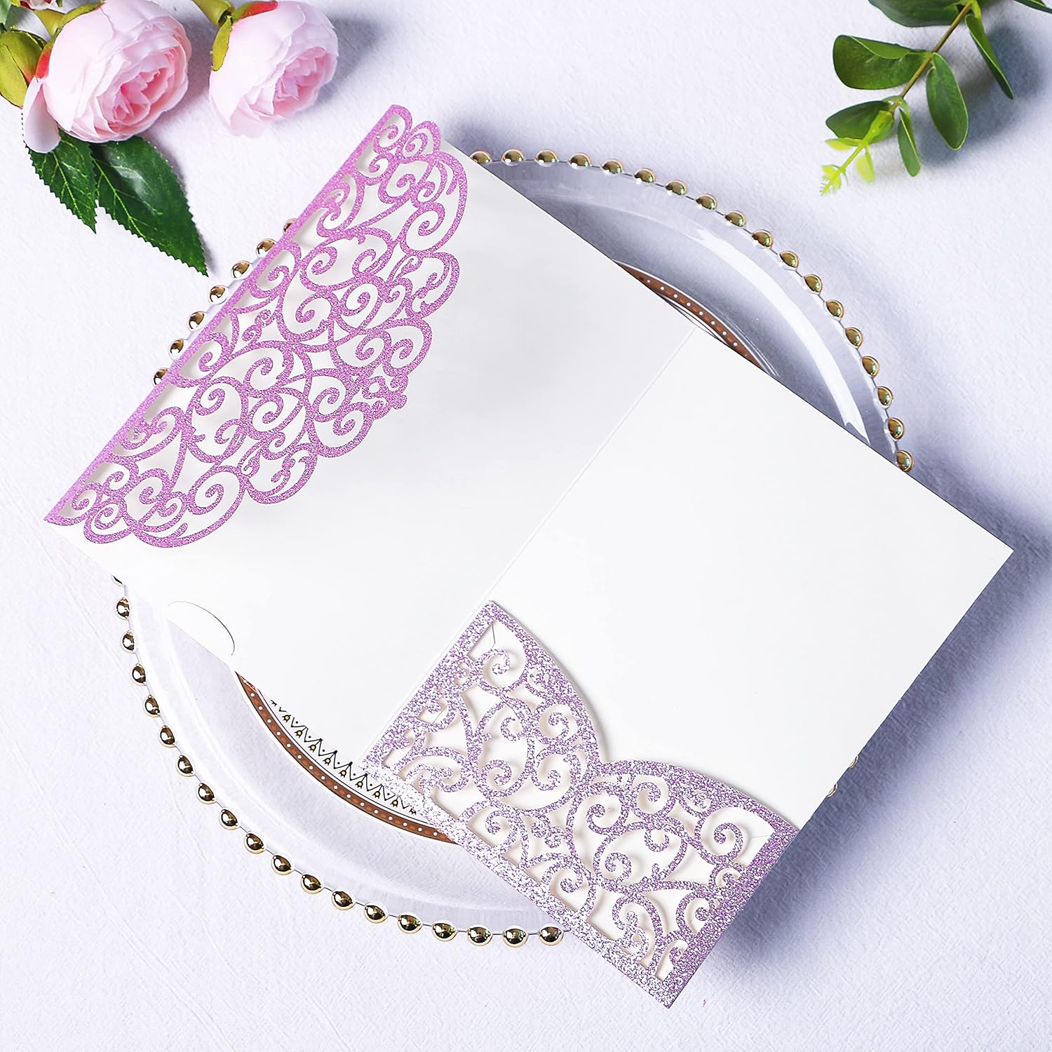 PONATIA 20 PCS Laser Cut Wedding Invitations Pockets with Envelopes for Wedding Party Bridal Shower Engagement Birthday Invite (Purple Glitter)