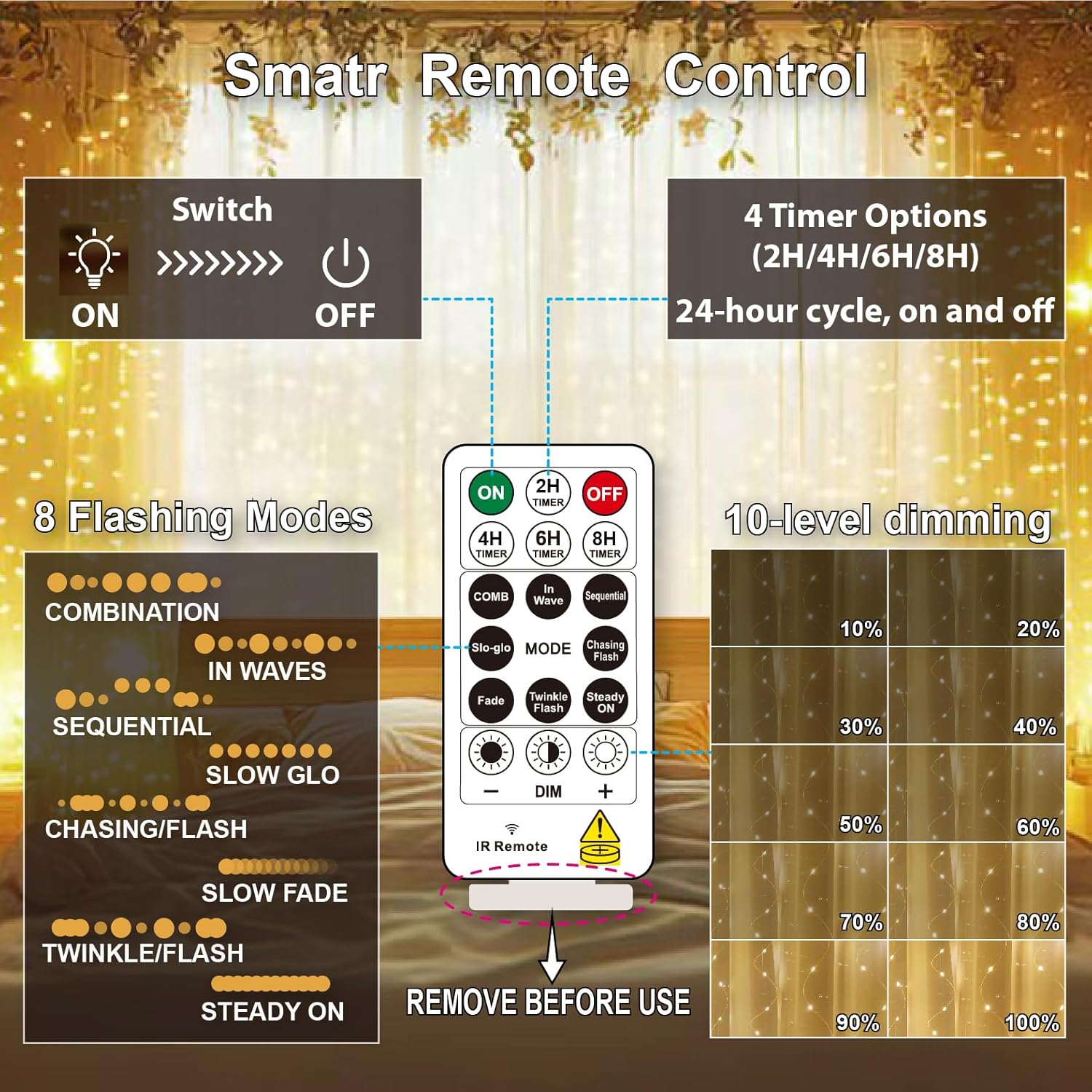 HXWEIYE 300LED Fairy Curtain Lights, 9.8x9.8Ft USB Plug-in 8 Modes Christmas String Hanging Lights with Remote for Bedroom Backdrop Wedding Party Indoor Wall Decor, Warm White(2 Pack)