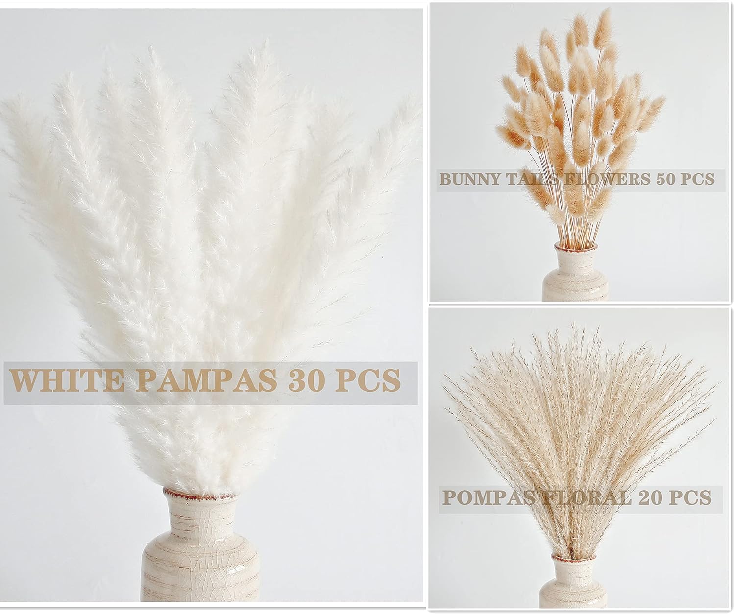 - More then one kind of pampas grass bouquet: carefully selected natural dried pampas grass decor, try to avoid deformation and breakage of dried pampas grass, 100 pieces of pampass grass contain 50 small pampas grass, 20 reed grass, 30 white pampas grass decor, (pampas grass vase not included) fill your vase, you can match it with different dried pompas floral bouquets according to your preference