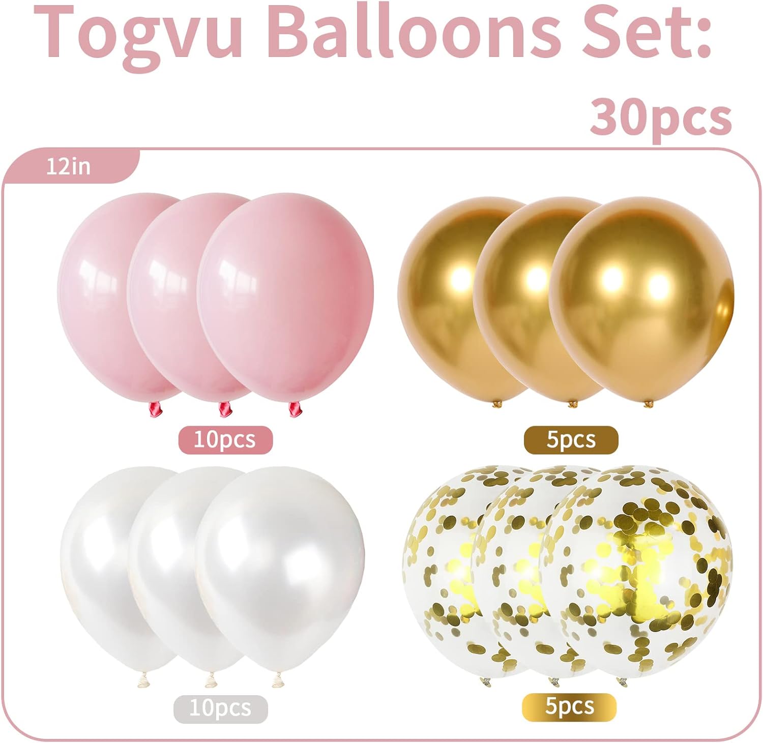- 🎈【Pink White Gold Balloons Set】You will get 4 different colors of 12 inch balloons, pastel pink 10 pcs, pearl white 10pcs, metallic gold 5pcs, gold confetti 5pcs, total 30 pieces, with 1pc white balloon ribbon.