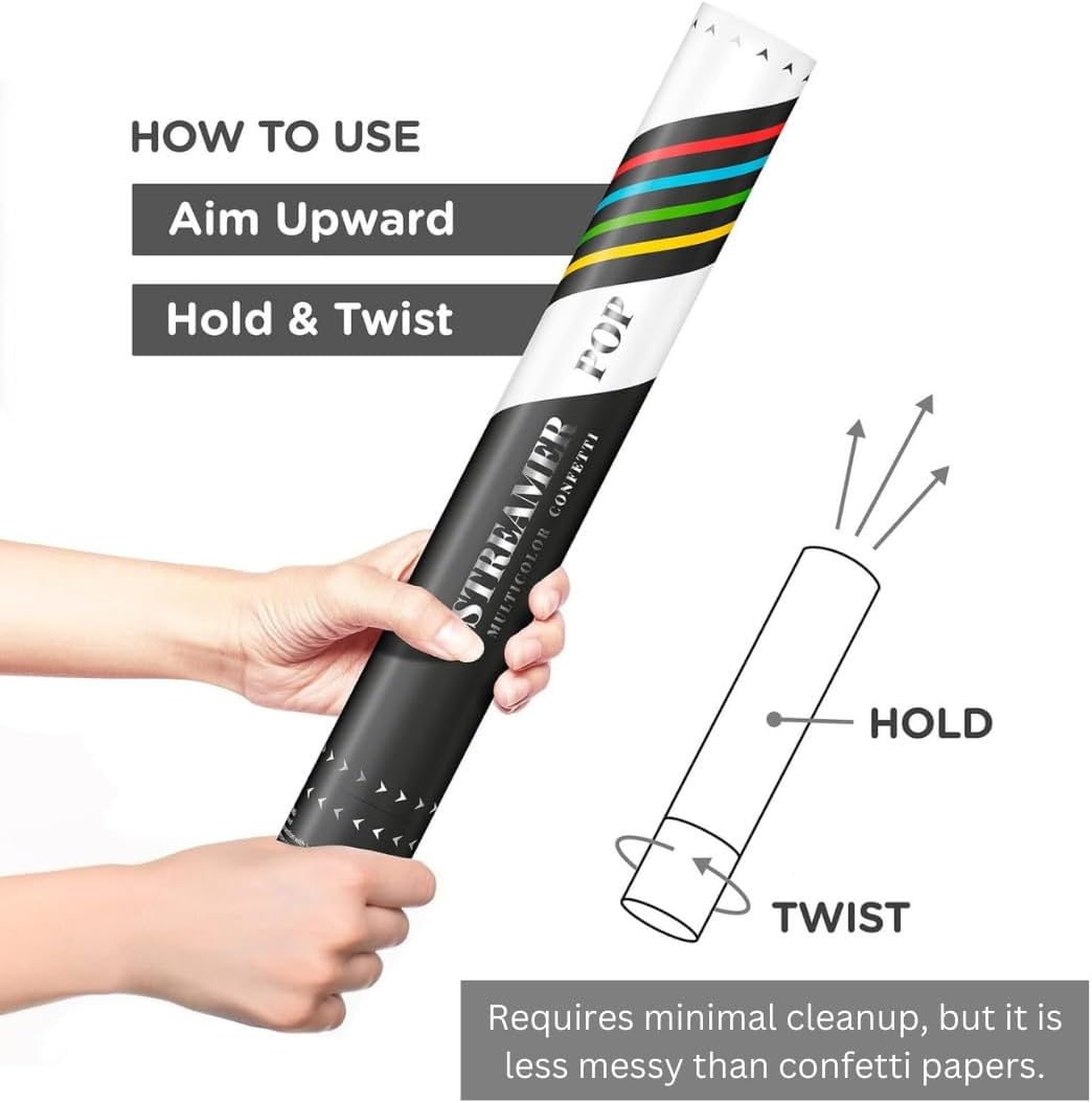 - š EASY POINT & TWIST ACTION - Don't need the strongest arms to blow up these babies! Point upwards away from people and twist to shoot, Streamer confetti paper is loaded on top of compressed air and is launched by twisting the cannon. Operation manual is included inside the box.
