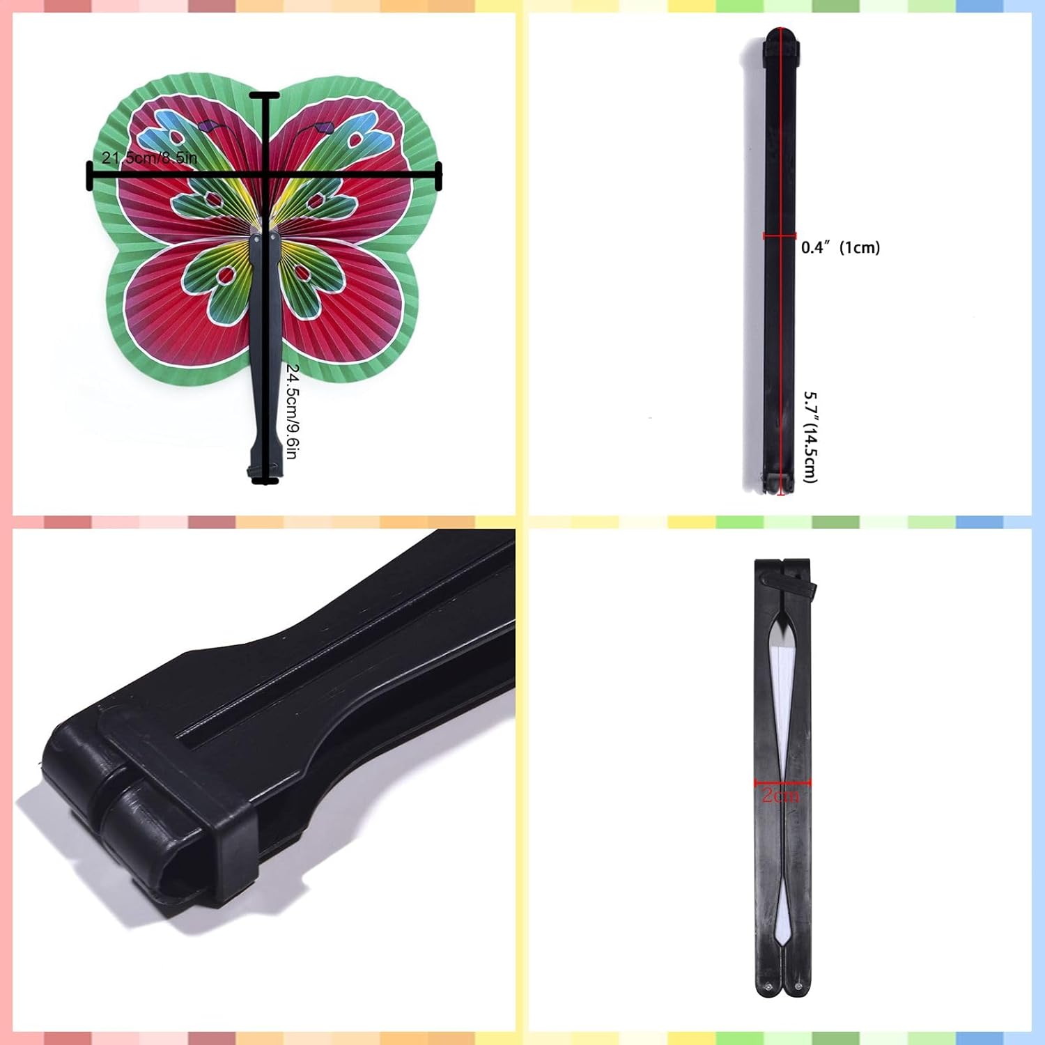 - SIZE:Each of these beautifully designed handheld fans measure- approx. 0.8” x 5.7” / 2 cm x 14.5 cm (folded size);approx. 8.4” x 9.6” / 21.5 cm x 24.5 cm (opened sized) and weighs 0.4 pounds.Perfect for both kids and adults.
