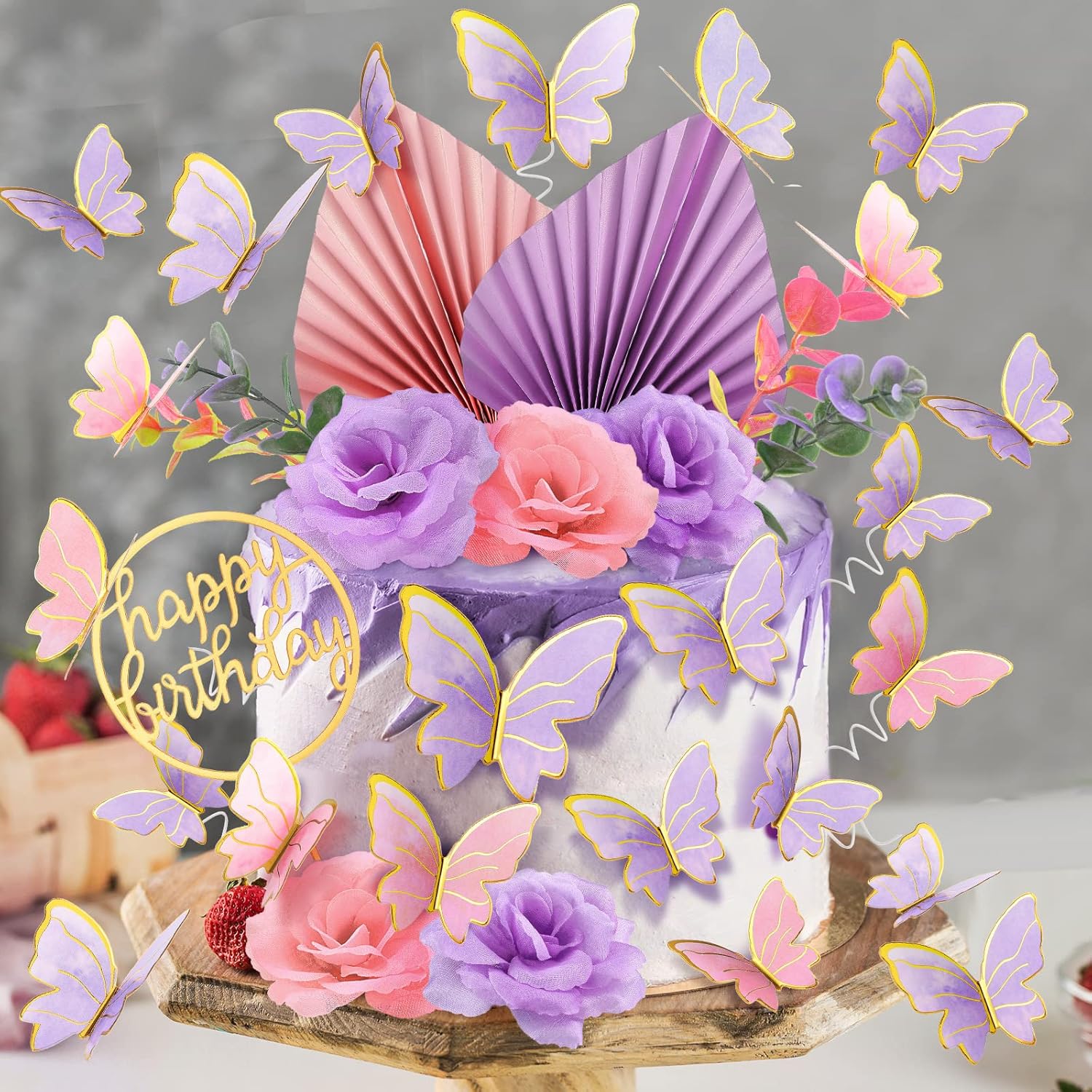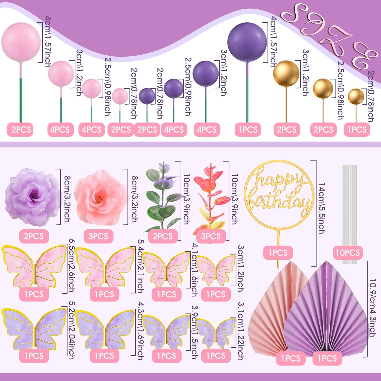 - Cake Decorations: the package comes 2 palm leaves, 1 happy birthday cake topper, 5 fake flowers, 2 fake wheat branches, 12 butterflies, 30 balls (5 pieces of 1.6 inch, 10 pieces of 1.2 inches, 10 pieces of 1 inch and 5 pieces of 0.78 inch), a total of 52 pieces of cake decorations, sufficient quantity and various styles can meet your decorative needs for cakes