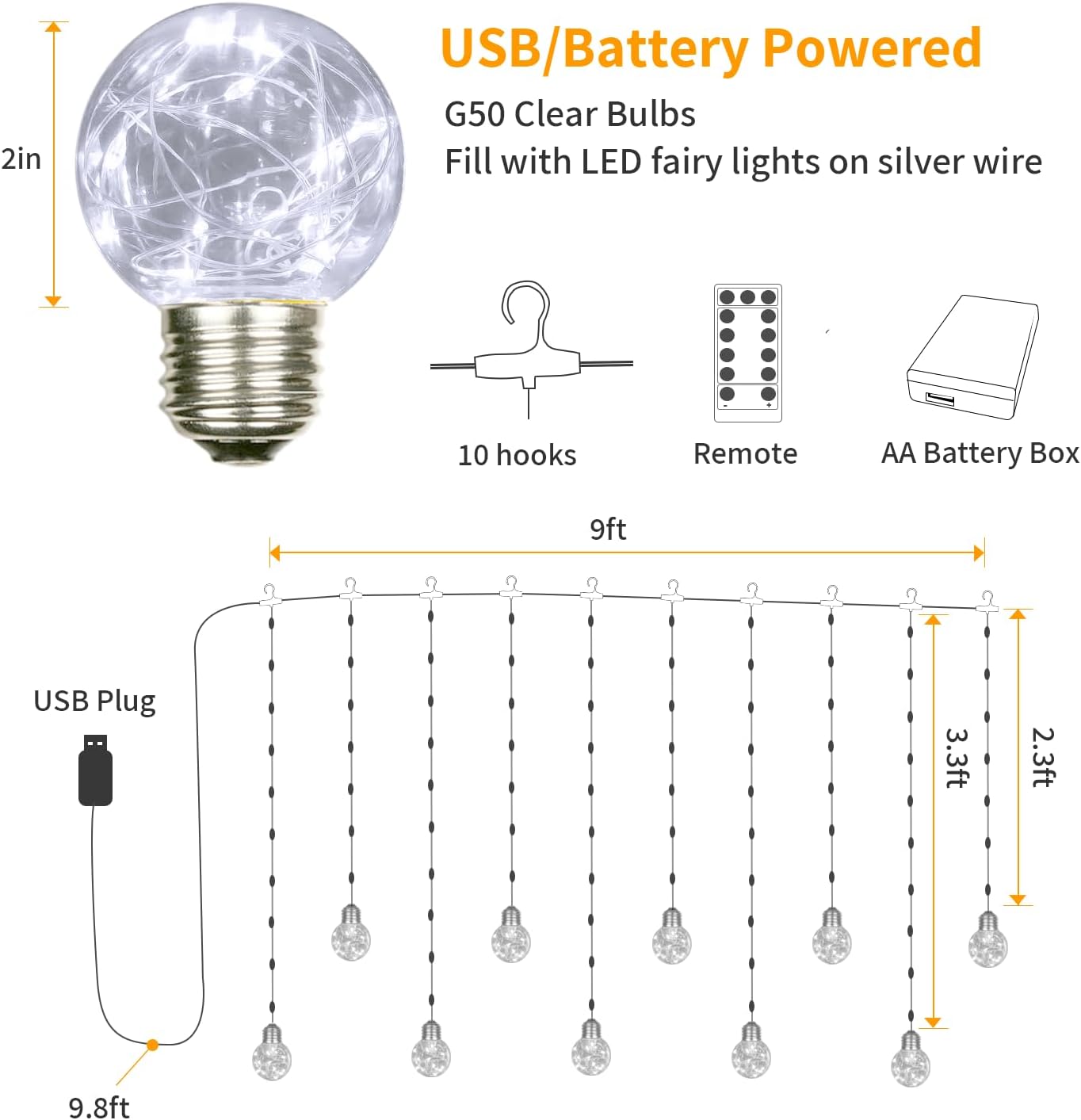 - [ 9.8x3.3 ft ] Wishing Ball Curtain Lights: The edison look bulbs are filled with fairy-like copper wire LEDs, hanging on silver wire curtain lights, to create a soft mode for just any place, add charm and character to your activities and provide relaxing mood lighting for party